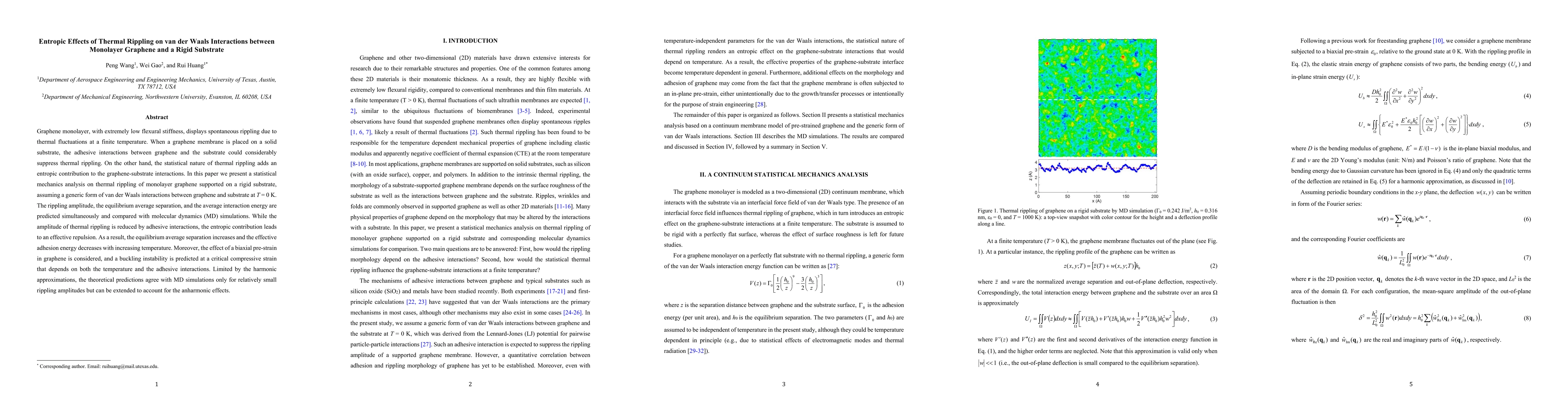 This paper analyzes the entropic effects of thermal rippling on van der Waals interactions between monolayer graphene on a rigid substrate, revealing that adhesive interactions reduce rippling amplitude while entropic contributions cause effective repulsion. Theoretical predictions show increased equilibrium separation and decreased effective adhesion energy with temperature, corroborated by molecular dynamics simulations for small rippling amplitudes.