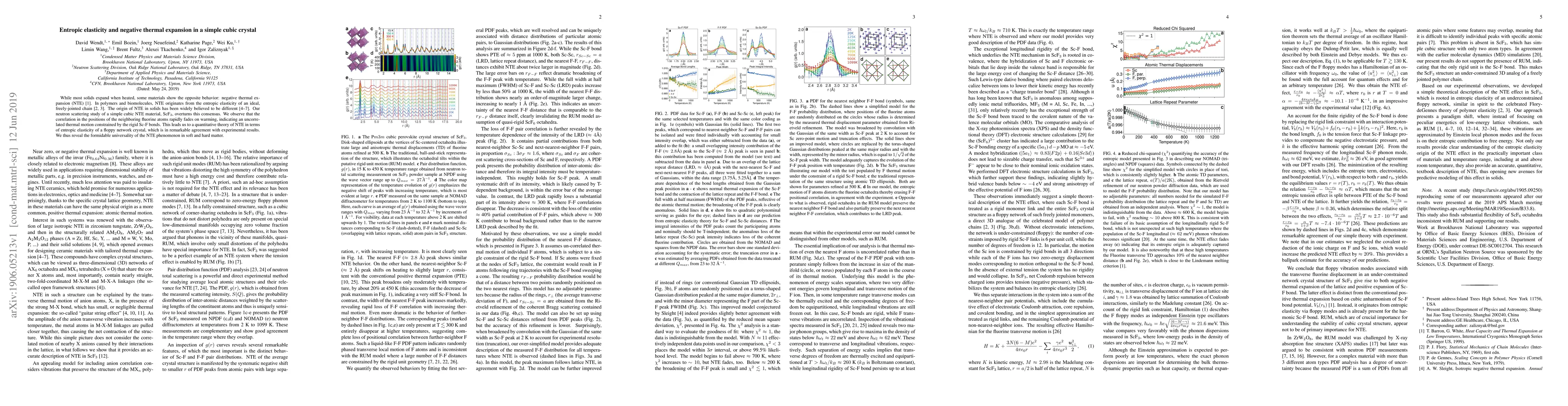 This study reveals that negative thermal expansion (NTE) in a simple cubic crystal, ScF3, arises from entropic elasticity similar to that in polymers, challenging the conventional belief that NTE in solids is different. The neutron scattering study shows that thermal motion of fluorine atoms becomes uncorrelated, leading to a quantitative theory of NTE based on the entropic elasticity of a floppy network crystal.