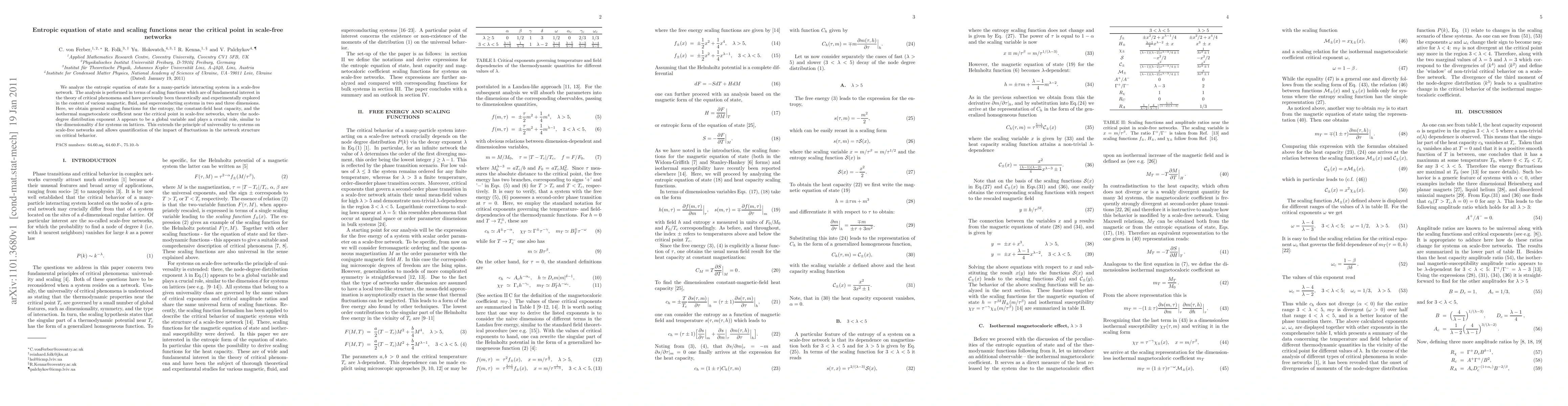 This paper investigates the entropic equation of state in scale-free networks near the critical point, deriving general scaling functions for entropy, heat capacity, and magnetocaloric effects. The analysis highlights the role of the node-degree distribution exponent, extending universality principles to scale-free networks and quantifying the influence of network structure fluctuations on critical behavior.