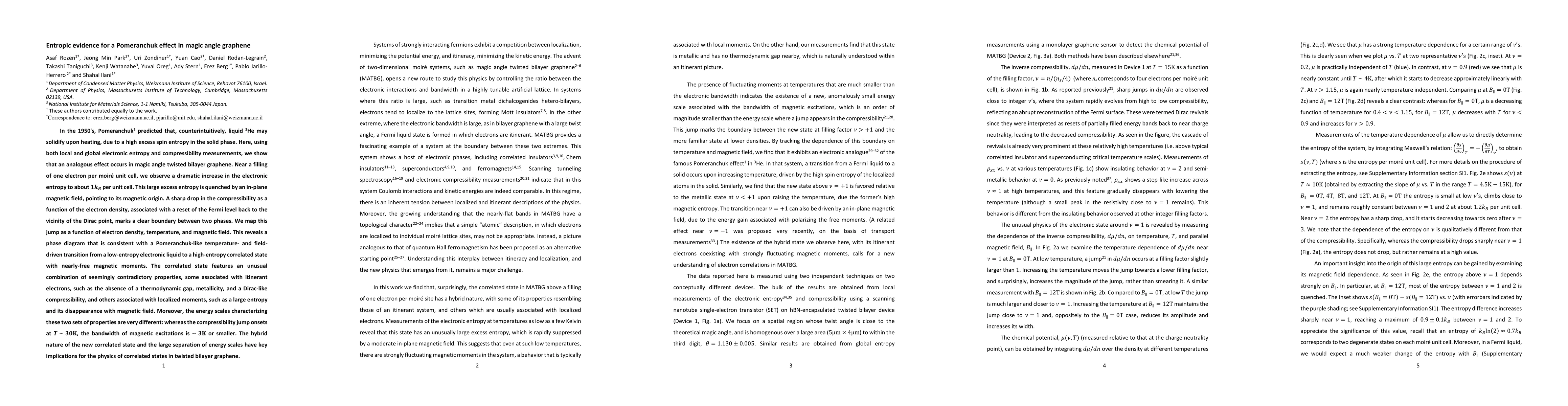 In the 1950's, Pomeranchuk predicted that, counterintuitively, liquid 3He may solidify upon heating, due to a high excess spin entropy in the solid phase. Here, using both local and global electronic entropy and compressibility measurements, we show that an analogous effect occurs in magic angle twisted bilayer graphene. Near a filling of one electron per moir'e unit cell, we observe a dramatic increase in the electronic entropy to about 1kB per unit cell. This large excess entropy is quenched by an in-plane magnetic field, pointing to its magnetic origin. A sharp drop in the compressibility as a function of the electron density, associated with a reset of the Fermi level back to the vicinity of the Dirac point, marks a clear boundary between two phases. We map this jump as a function of electron density, temperature, and magnetic field. This reveals a phase diagram that is consistent with a Pomeranchuk-like temperature- and field-driven transition from a low-entropy electronic liquid to a high-entropy correlated state with nearly-free magnetic moments. The correlated state features an unusual combination of seemingly contradictory properties, some associated with itinerant electrons, such as the absence of a thermodynamic gap, metallicity, and a Dirac-like compressibility, and others associated with localized moments, such as a large entropy and its disappearance with magnetic field. Moreover, the energy scales characterizing these two sets of properties are very different: whereas the compressibility jump onsets at T~30K, the bandwidth of magnetic excitations is ~3K or smaller. The hybrid nature of the new correlated state and the large separation of energy scales have key implications for the physics of correlated states in twisted bilayer graphene.