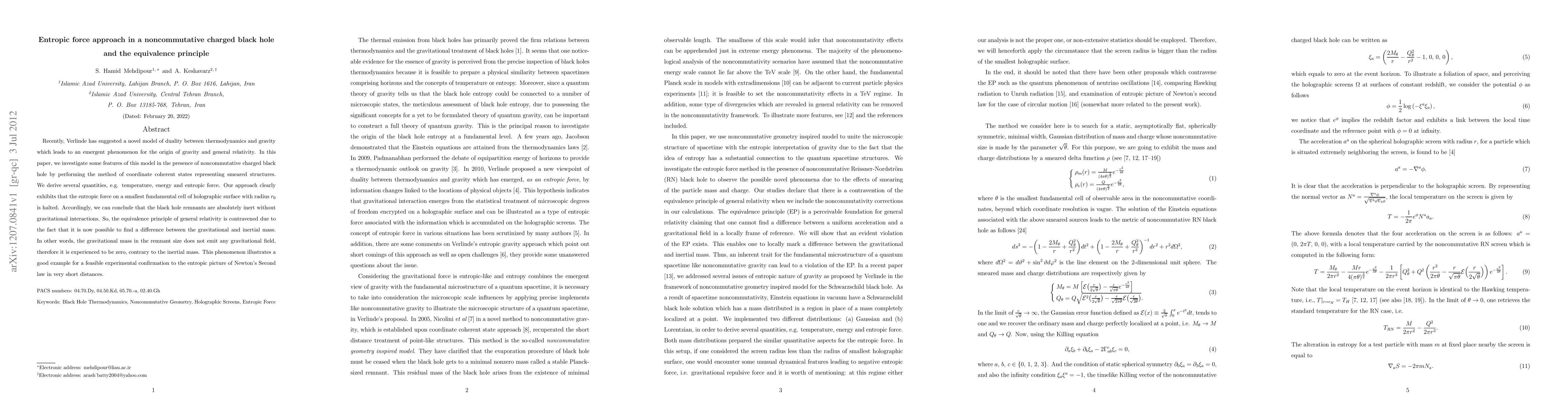 This paper explores Verlinde's entropic force model in noncommutative charged black holes, revealing that black hole remnants exhibit no gravitational interactions, contradicting the equivalence principle by suggesting a difference between gravitational and inertial mass. This finding supports the entropic interpretation of Newton's Second law at extremely small scales.