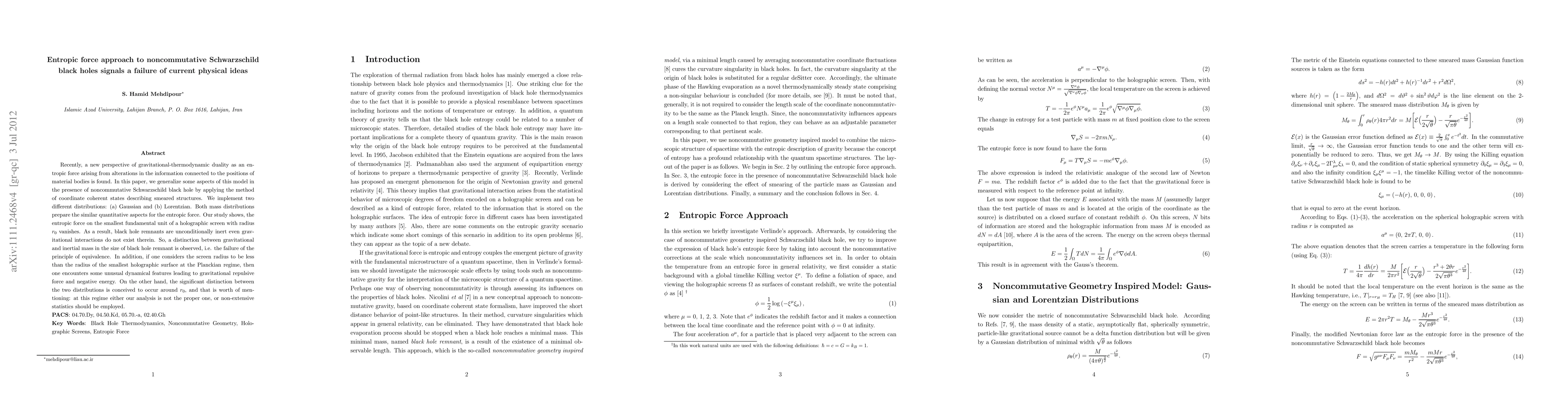 This paper explores the entropic force approach to noncommutative Schwarzschild black holes, revealing a failure of current physical principles. It finds that black hole remnants are inert even under gravitational interactions, indicating a breakdown of the equivalence principle.