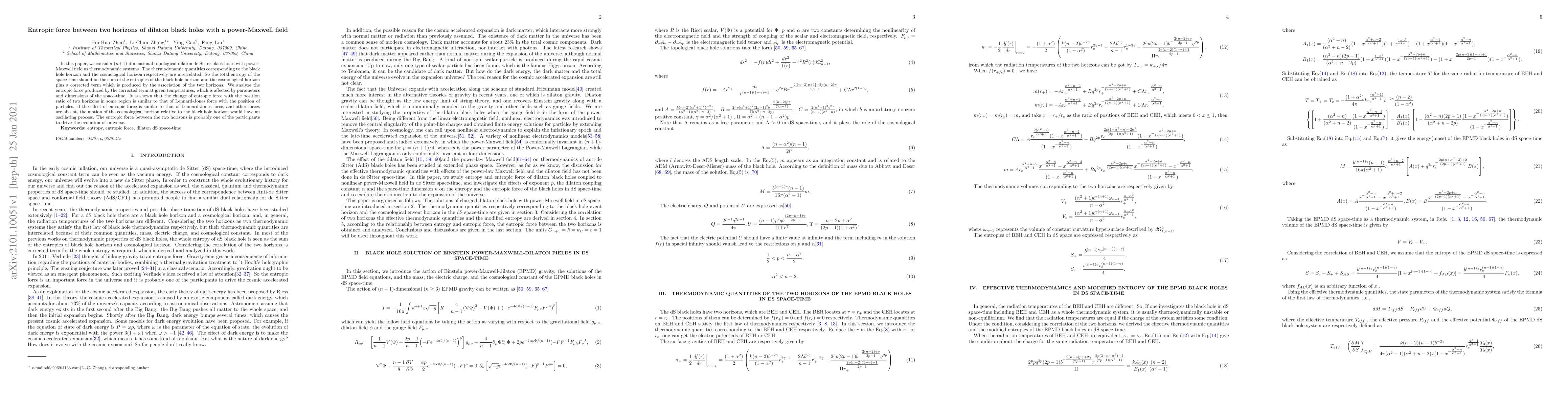 The paper explores the entropic force between two horizons in (n+1)-dimensional dilaton de Sitter black holes with power-Maxwell field, finding a corrected entropy term linking black hole and cosmological horizons. This force, influenced by space-time parameters and dimensions, exhibits oscillatory motion akin to Lennard-Jones force, potentially impacting the universe's evolution.