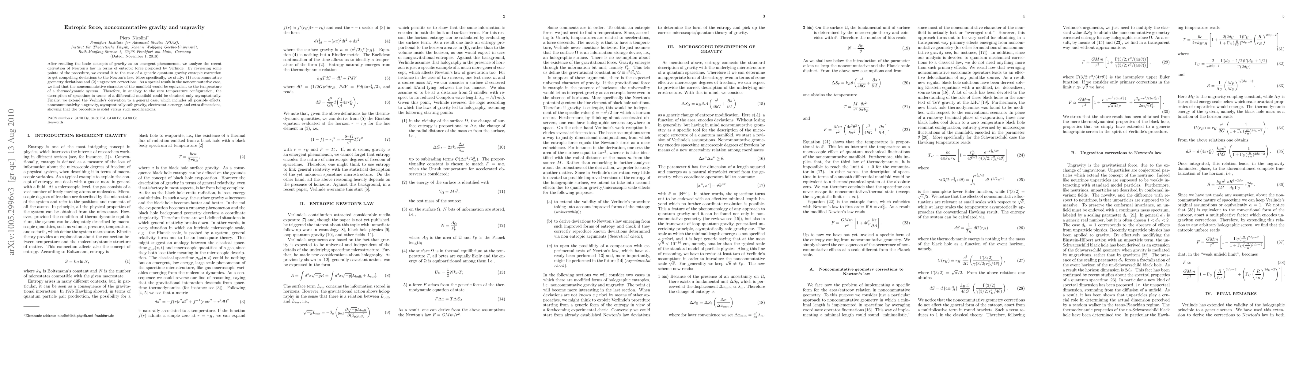 After recalling the basic concepts of gravity as an emergent phenomenon, we analyze the recent derivation of Newton's law in terms of entropic force proposed by Verlinde. By reviewing some points of the procedure, we extend it to the case of a generic quantum gravity entropic correction to get compelling deviations to the Newton's law. More specifically, we study: (1) noncommutative geometry deviations and (2) ungraviton corrections. As a special result in the noncommutative case, we find that the noncommutative character of the manifold would be equivalent to the temperature of a thermodynamic system. Therefore, in analogy to the zero temperature configuration, the description of spacetime in terms of a differential manifold could be obtained only asymptotically. Finally, we extend the Verlinde's derivation to a general case, which includes all possible effects, noncommutativity, ungravity, asymptotically safe gravity, electrostatic energy, and extra dimensions, showing that the procedure is solid versus such modifications.