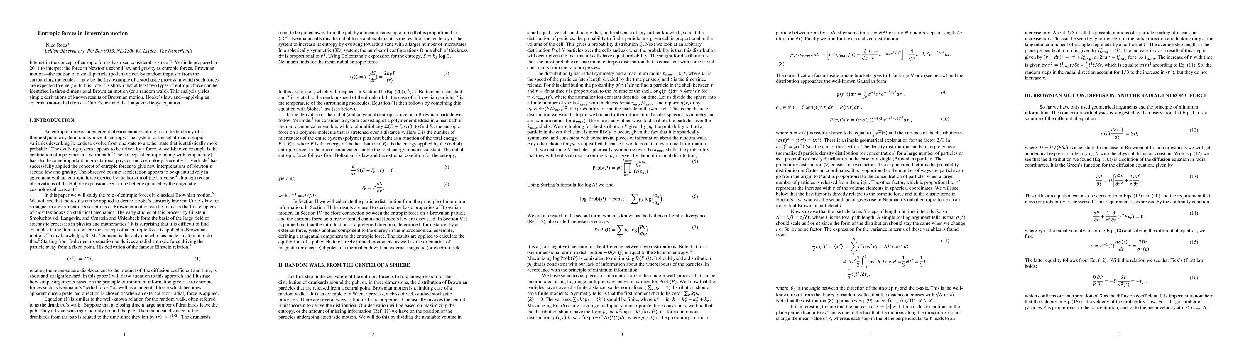This paper explores entropic forces in the context of Brownian motion, demonstrating that two types of entropic forces emerge in 3D Brownian motion. It provides derivations for known results such as Hooke's law, Curie's law, and the Langevin-Debye equation.