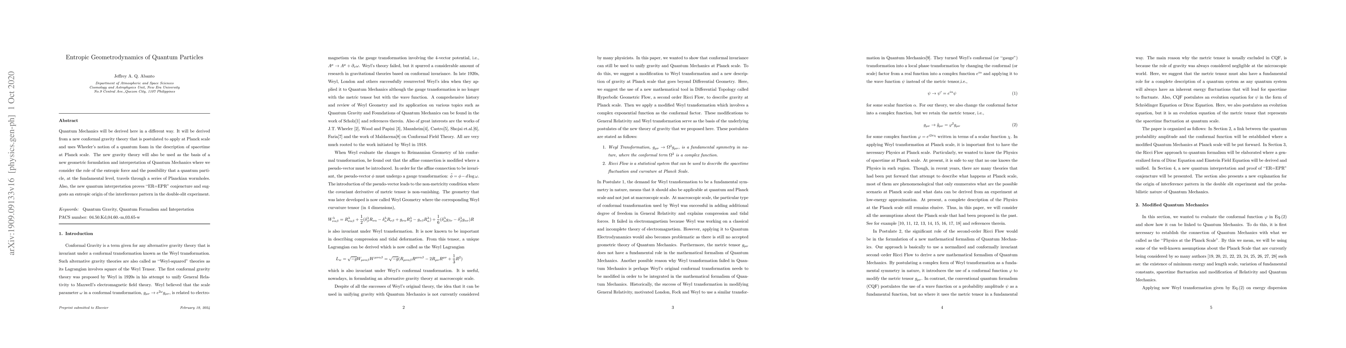 This paper proposes a novel conformal gravity theory at the Planck scale, deriving Quantum Mechanics from it and interpreting quantum particles as traveling through Planckian wormholes, supporting the "ER=EPR" conjecture and suggesting an entropic origin of interference patterns in the double-slit experiment.