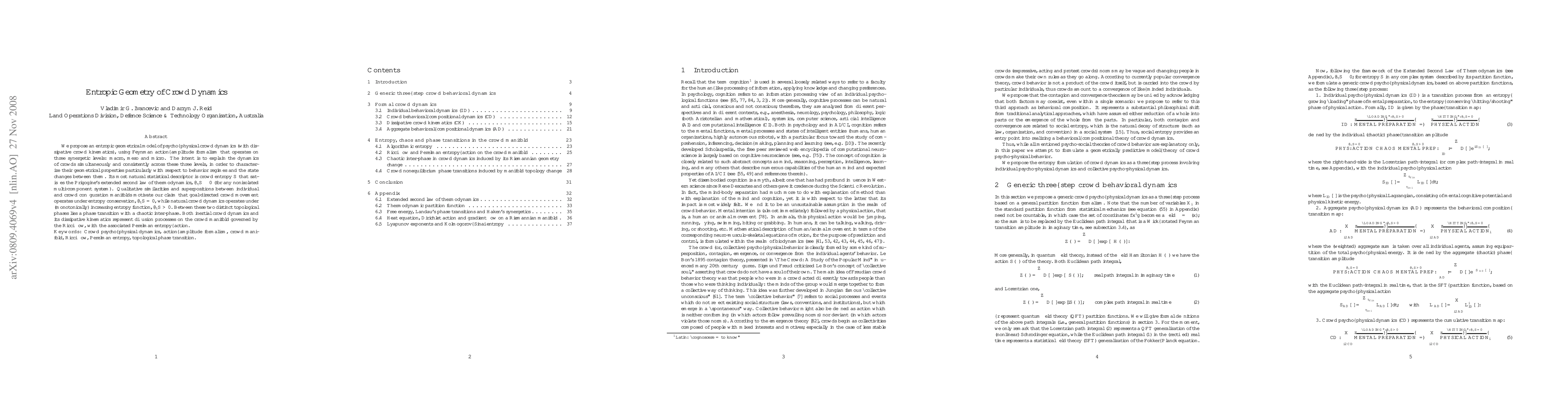 We propose an entropic geometrical model of psycho-physical crowd dynamics (with dissipative crowd kinematics), using Feynman action-amplitude formalism that operates on three synergetic levels: macro, meso and micro. The intent is to explain the dynamics of crowds simultaneously and consistently across these three levels, in order to characterize their geometrical properties particularly with respect to behavior regimes and the state changes between them. Its most natural statistical descriptor is crowd entropy $S$ that satisfies the Prigogine's extended second law of thermodynamics, $\partial_tS\geq 0$ (for any nonisolated multi-component system). Qualitative similarities and superpositions between individual and crowd configuration manifolds motivate our claim that goal-directed crowd movement operates under entropy conservation, $\partial_tS = 0$, while natural crowd dynamics operates under (monotonically) increasing entropy function, $\partial_tS > 0$. Between these two distinct topological phases lies a phase transition with a chaotic inter-phase. Both inertial crowd dynamics and its dissipative kinematics represent diffusion processes on the crowd manifold governed by the Ricci flow, with the associated Perelman entropy-action. Keywords: Crowd psycho-physical dynamics, action-amplitude formalism, crowd manifold, Ricci flow, Perelman entropy, topological phase transition