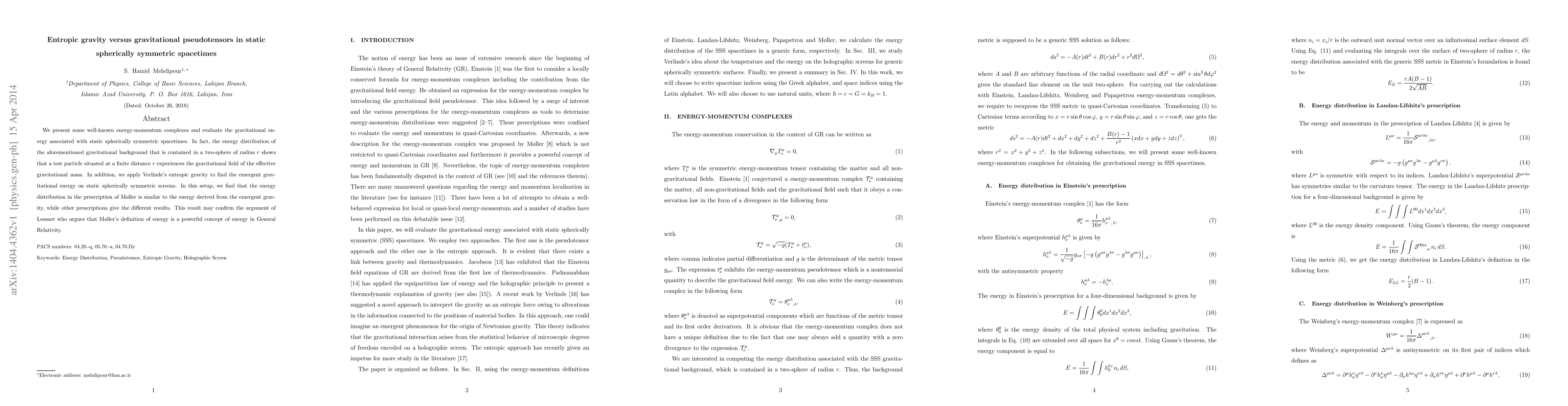 This paper evaluates gravitational energy in static spherically symmetric spacetimes using various energy-momentum complexes and finds that Møller's prescription aligns with Verlinde's entropic gravity, supporting Lessner's view on its significance in General Relativity.