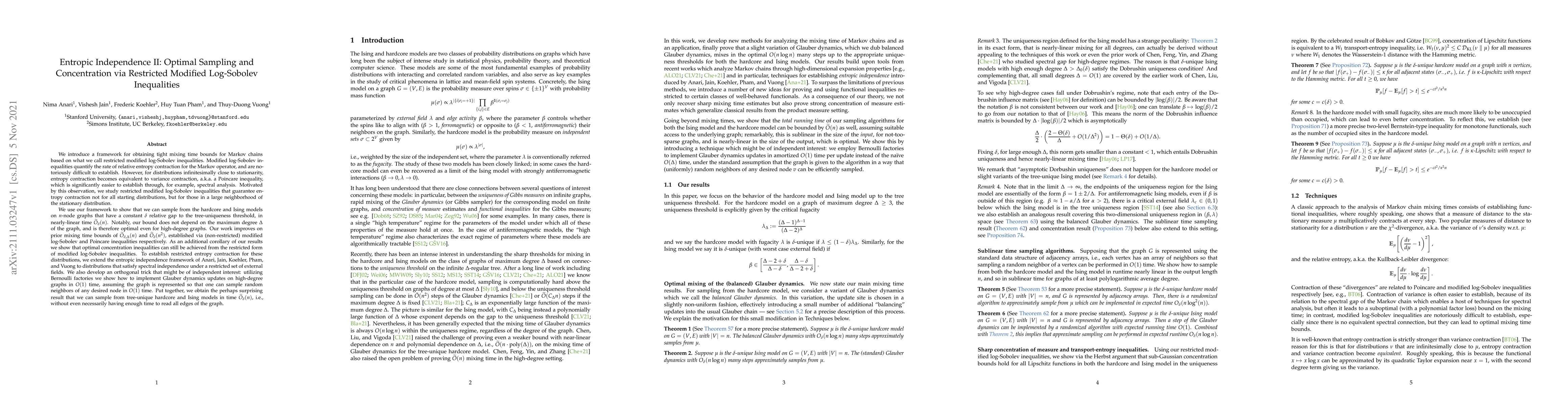 We introduce a framework for obtaining tight mixing times for Markov chains based on what we call restricted modified log-Sobolev inequalities. Modified log-Sobolev inequalities (MLSI) quantify the rate of relative entropy contraction for the Markov operator, and are notoriously difficult to establish. However, infinitesimally close to stationarity, entropy contraction becomes equivalent to variance contraction, a.k.a. a Poincare inequality, which is significantly easier to establish through, e.g., spectral analysis. Motivated by this observation, we study restricted modified log-Sobolev inequalities that guarantee entropy contraction not for all starting distributions, but for those in a large neighborhood of the stationary distribution. We show how to sample from the hardcore and Ising models on $n$-node graphs that have a constant $\delta$ relative gap to the tree-uniqueness threshold, in nearly-linear time $\widetilde O_{\delta}(n)$. Notably, our bound does not depend on the maximum degree $\Delta$, and is therefore optimal even for high-degree graphs. This improves on prior mixing time bounds of $\widetilde O_{\delta, \Delta}(n)$ and $\widetilde O_{\delta}(n^2)$, established via (non-restricted) modified log-Sobolev and Poincare inequalities respectively. We further show that optimal concentration inequalities can still be achieved from the restricted form of modified log-Sobolev inequalities. To establish restricted entropy contraction, we extend the entropic independence framework of Anari, Jain, Koehler, Pham, and Vuong to the setting of distributions that are spectrally independent under a restricted set of external fields. We also develop an orthogonal trick that might be of independent interest: utilizing Bernoulli factories we show how to implement Glauber dynamics updates on high-degree graphs in $O(1)$ time, assuming standard adjacency array representation of the graph.