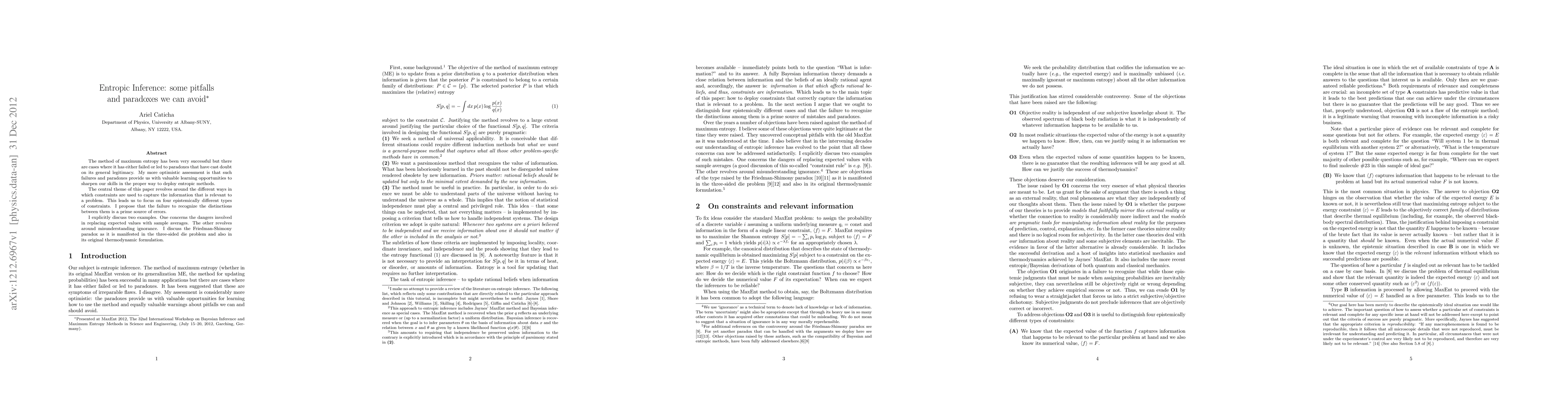 The method of maximum entropy has been very successful but there are cases where it has either failed or led to paradoxes that have cast doubt on its general legitimacy. My more optimistic assessment is that such failures and paradoxes provide us with valuable learning opportunities to sharpen our skills in the proper way to deploy entropic methods. The central theme of this paper revolves around the different ways in which constraints are used to capture the information that is relevant to a problem. This leads us to focus on four epistemically different types of constraints. I propose that the failure to recognize the distinctions between them is a prime source of errors. I explicitly discuss two examples. One concerns the dangers involved in replacing expected values with sample averages. The other revolves around misunderstanding ignorance. I discuss the Friedman-Shimony paradox as it is manifested in the three-sided die problem and also in its original thermodynamic formulation.