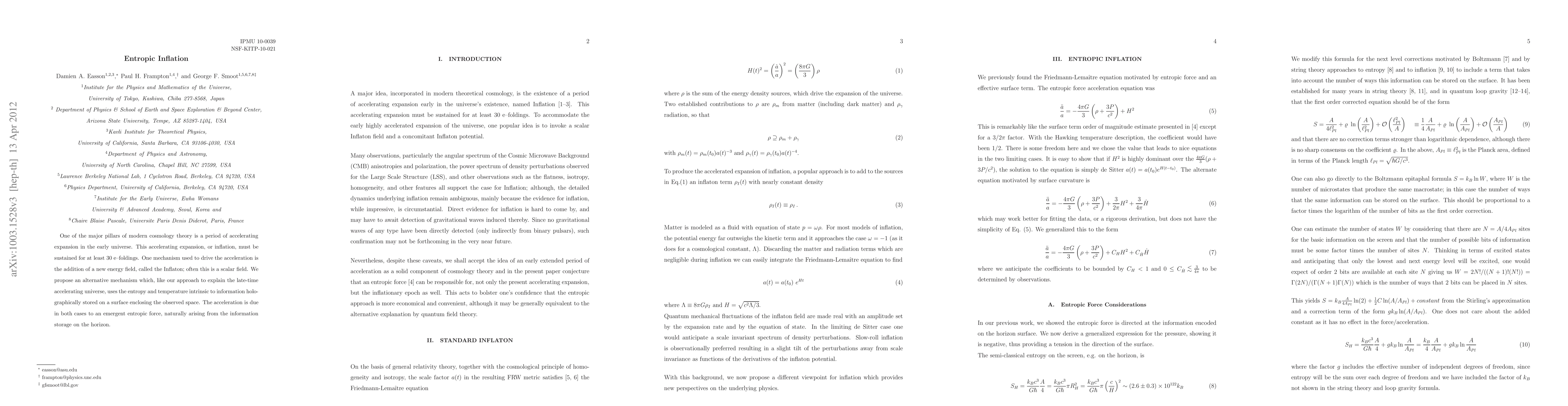 Title: Entropic Inflation Summary: This paper proposes an alternative inflationary mechanism driven by entropic forces arising from information holographically stored on the event horizon, replacing the traditional scalar field Inflaton. The inflationary expansion is sustained by these emergent entropic forces.