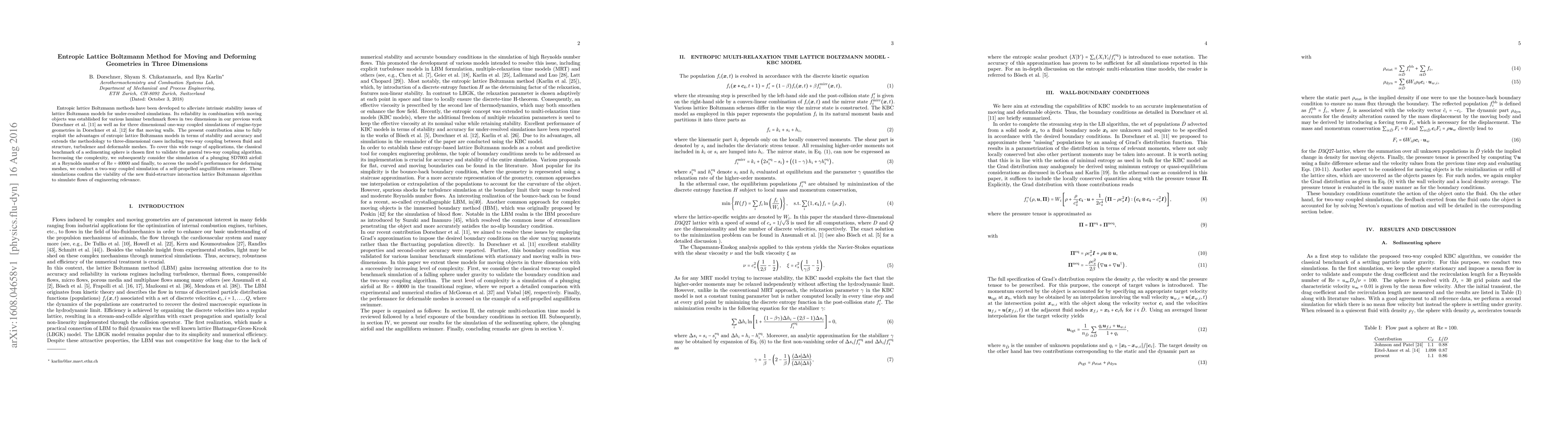 The paper presents an entropic lattice Boltzmann method for stable and accurate simulations of three-dimensional fluid dynamics involving moving and deforming geometries, validated through benchmarks such as sedimenting spheres, plunging airfoils, and self-propelled swimmers. This method extends previous work to handle complex fluid-structure interactions and deformable meshes.