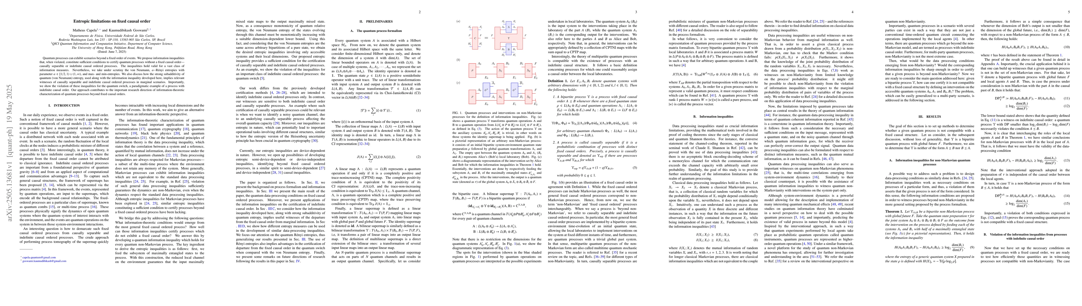 The paper proposes information inequalities to certify quantum processes without a fixed causal order, examining various entropy measures including von Neumann, $\alpha$-Rényi, max- and min-entropies.