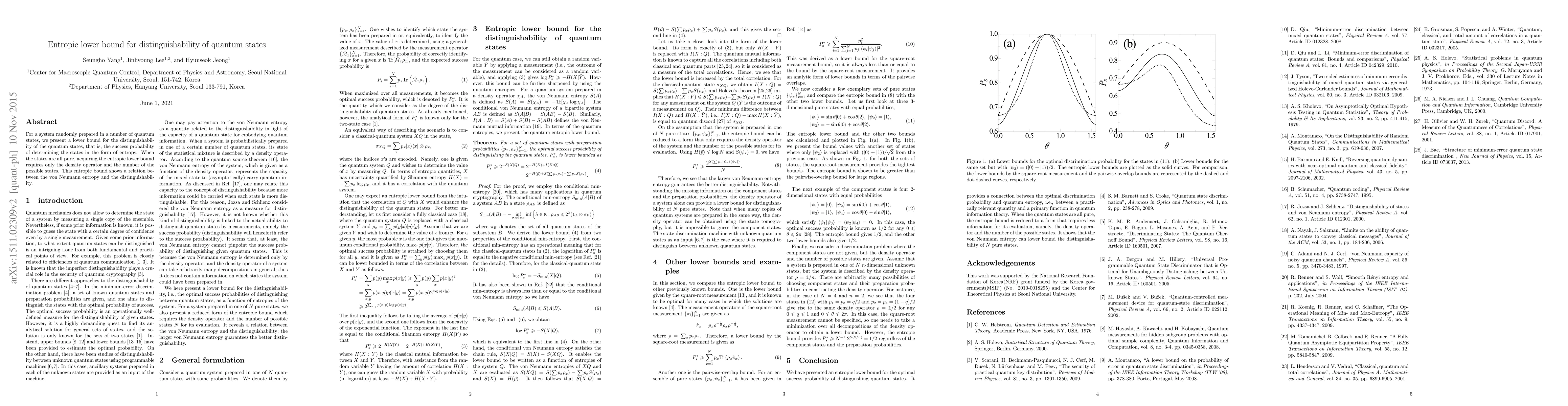 This paper establishes an entropic lower bound for the distinguishability of quantum states, showing that the success probability of determining the states relates to the von Neumann entropy, which depends solely on the density operator and the number of possible states when all states are pure.