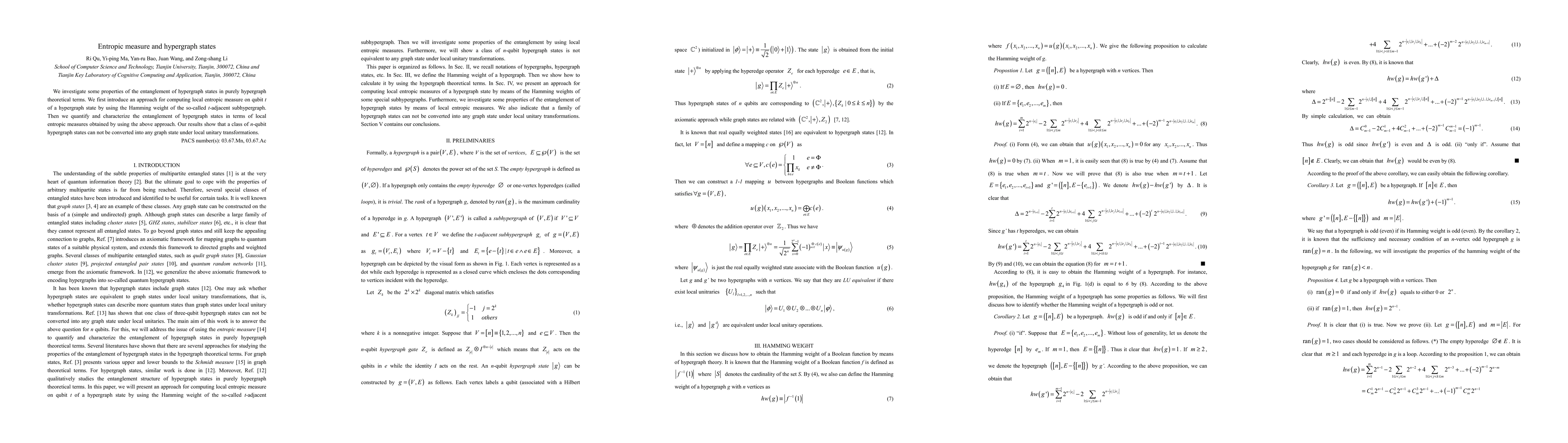 This paper introduces a method for calculating local entropic measures on qubits within hypergraph states using the Hamming weight of t-adjacent subhypergraphs. It characterizes the entanglement of hypergraph states through these measures and concludes that certain n-qubit hypergraph states cannot be transformed into graph states via local unitary operations.