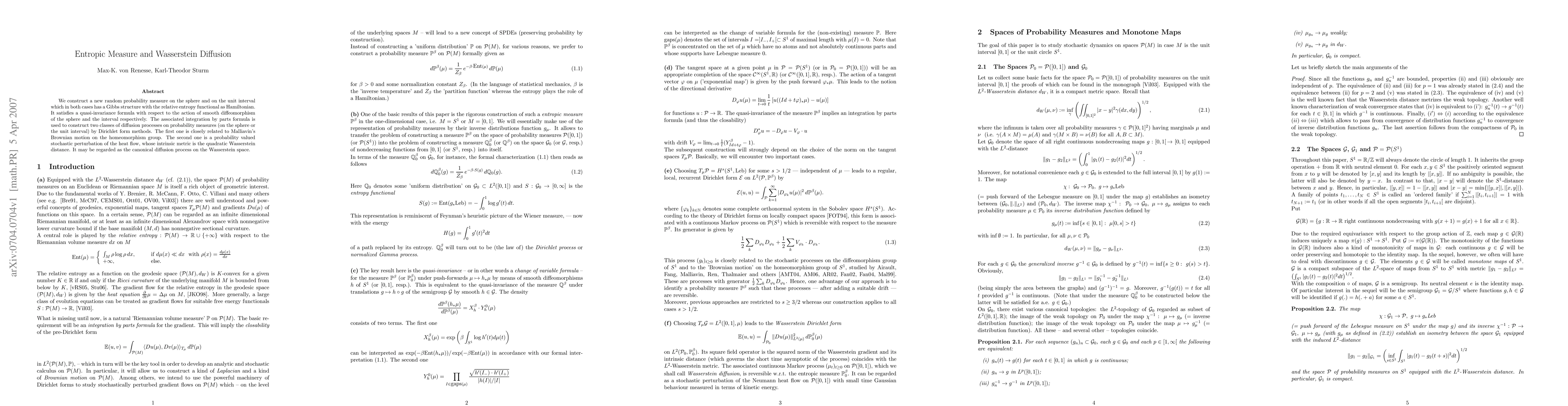 The work presents a unique approach to constructing diffusion processes on probability measures using entropic measures and Wasserstein geometry, offering new insights into stochastic dynamics on manifolds.