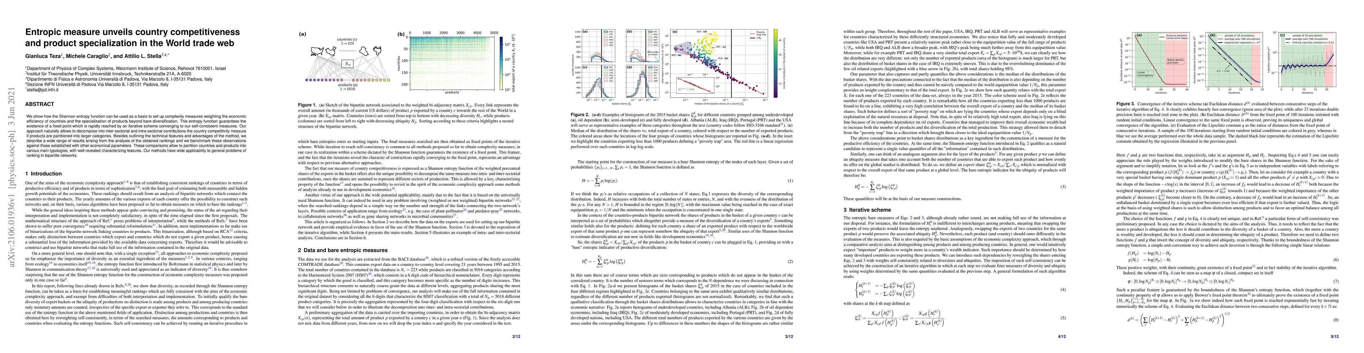 We show how the Shannon entropy function can be used as a basis to set up complexity measures weighting the economic efficiency of countries and the specialization of products beyond bare diversification. This entropy function guarantees the existence of a fixed point which is rapidly reached by an iterative scheme converging to our self-consistent measures. Our approach naturally allows to decompose into inter-sectorial and intra-sectorial contributions the country competitivity measure if products are partitioned into larger categories. Besides outlining the technical features and advantages of the method, we describe a wide range of results arising from the analysis of the obtained rankings and we benchmark these observations against those established with other economical parameters. These comparisons allow to partition countries and products into various main typologies, with well-revealed characterizing features. Our methods have wide applicability to general problems of ranking in bipartite networks.