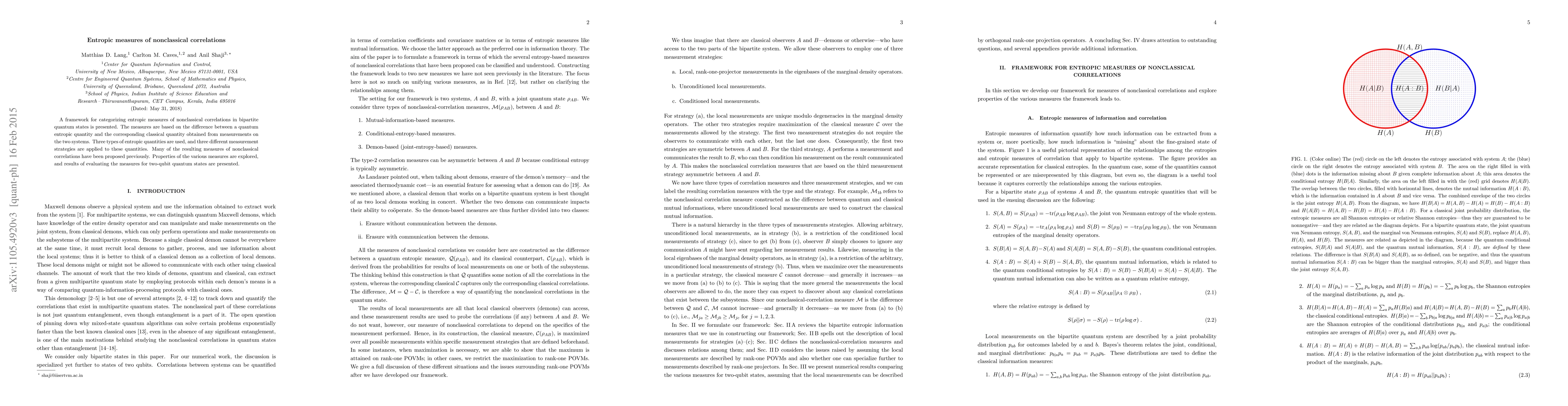 This paper introduces a framework for entropic measures of nonclassical correlations in bipartite quantum states, comparing quantum and classical entropic quantities. The study evaluates various measures for two-qubit states, highlighting their properties and previous proposals.