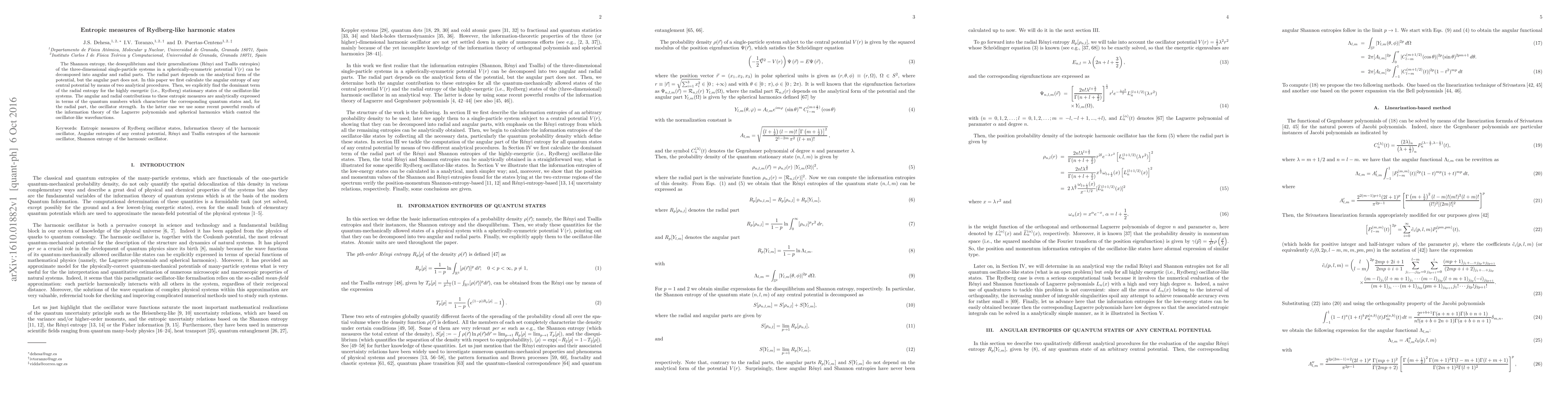 The Shannon entropy, the desequilibrium and their generalizations (R\'enyi and Tsallis entropies) of the three-dimensional single-particle systems in a spherically-symmetric potential $V(r)$ can be decomposed into angular and radial parts. The radial part depends on the analytical form of the potential, but the angular part does not. In this paper we first calculate the angular entropy of any central potential by means of two analytical procedures. Then, we explicitly find the dominant term of the radial entropy for the highly energetic (i.e., Rydberg) stationary states of the oscillator-like systems. The angular and radial contributions to these entropic measures are analytically expressed in terms of the quantum numbers which characterize the corresponding quantum states and, for the radial part, the oscillator strength. In the latter case we use some recent powerful results of the information theory of the Laguerre polynomials and spherical harmonics which control the oscillator-like wavefunctions.