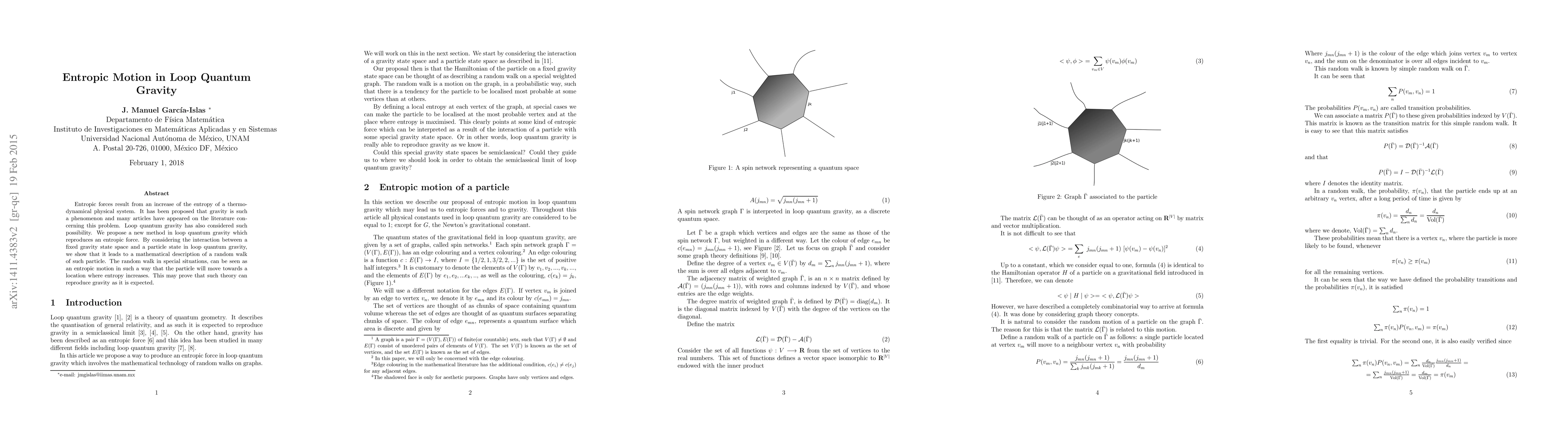 This paper proposes a novel method in loop quantum gravity that demonstrates entropic forces by showing how interactions between gravity state space and particle states lead to a random walk, effectively entropic motion, potentially proving that loop quantum gravity can reproduce gravitational effects.