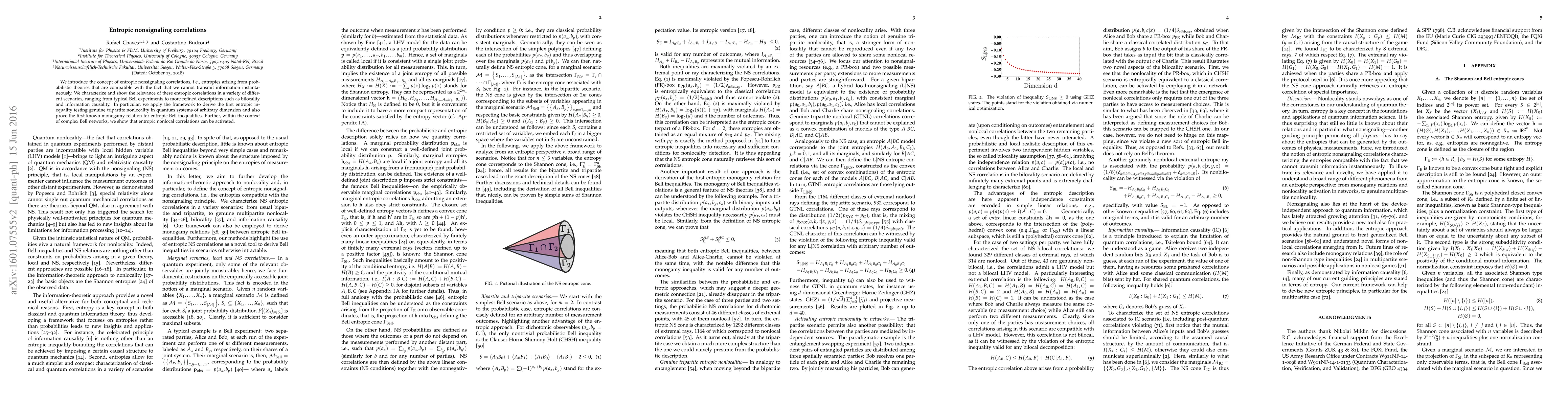 This paper introduces entropic nonsignaling correlations, which arise from probabilistic theories that respect the no-instantaneous-information-transmission principle. It characterizes these correlations and applies them to derive the first entropic inequality for genuine tripartite nonlocality in quantum systems and to prove the first monogamy relation for entropic Bell inequalities.