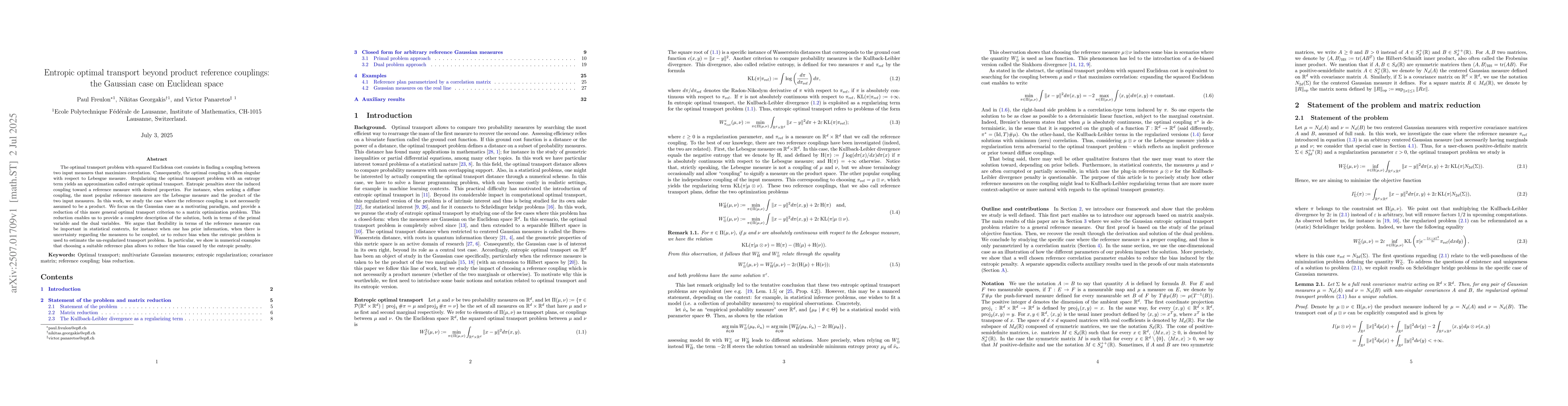 The paper's main technical contribution is the reduction of entropic optimal transport beyond product reference couplings to a matrix optimization problem, providing a comprehensive solution for the Gaussian case.