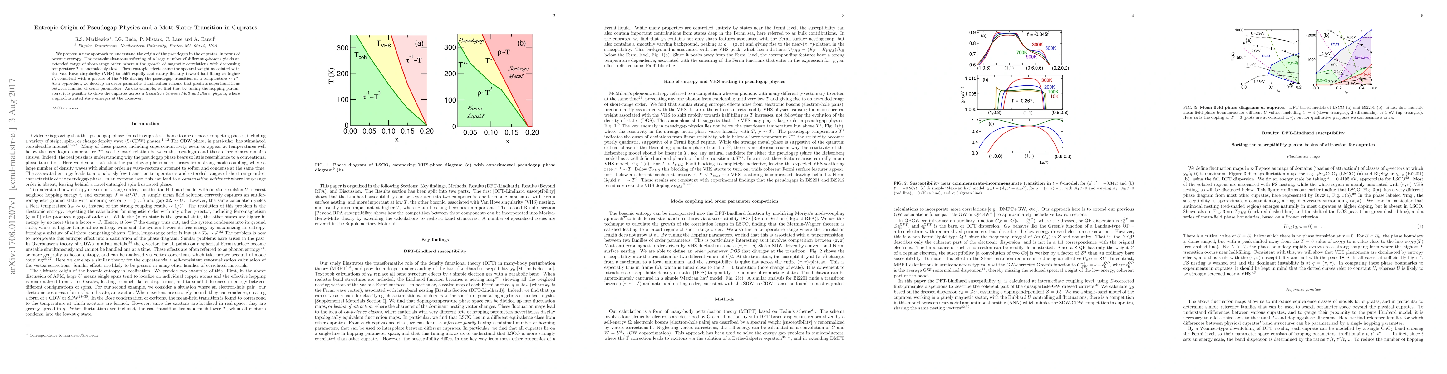 We propose a new approach to understand the origin of the pseudogap in the cuprates, in terms of bosonic entropy. The near-simultaneous softening of a large number of different $q$-bosons yields an extended range of short-range order, wherein the growth of magnetic correlations with decreasing temperature $T$ is anomalously slow. These entropic effects cause the spectral weight associated with the Van Hove singularity (VHS) to shift rapidly and nearly linearly toward half filling at higher $T$, consistent with a picture of the VHS driving the pseudogap transition at a temperature $\sim T^*$. As a byproduct, we develop an order-parameter classification scheme that predicts supertransitions between families of order parameters. As one example, we find that by tuning the hopping parameters, it is possible to drive the cuprates across a {\it transition between Mott and Slater physics}, where a spin-frustrated state emerges at the crossover.