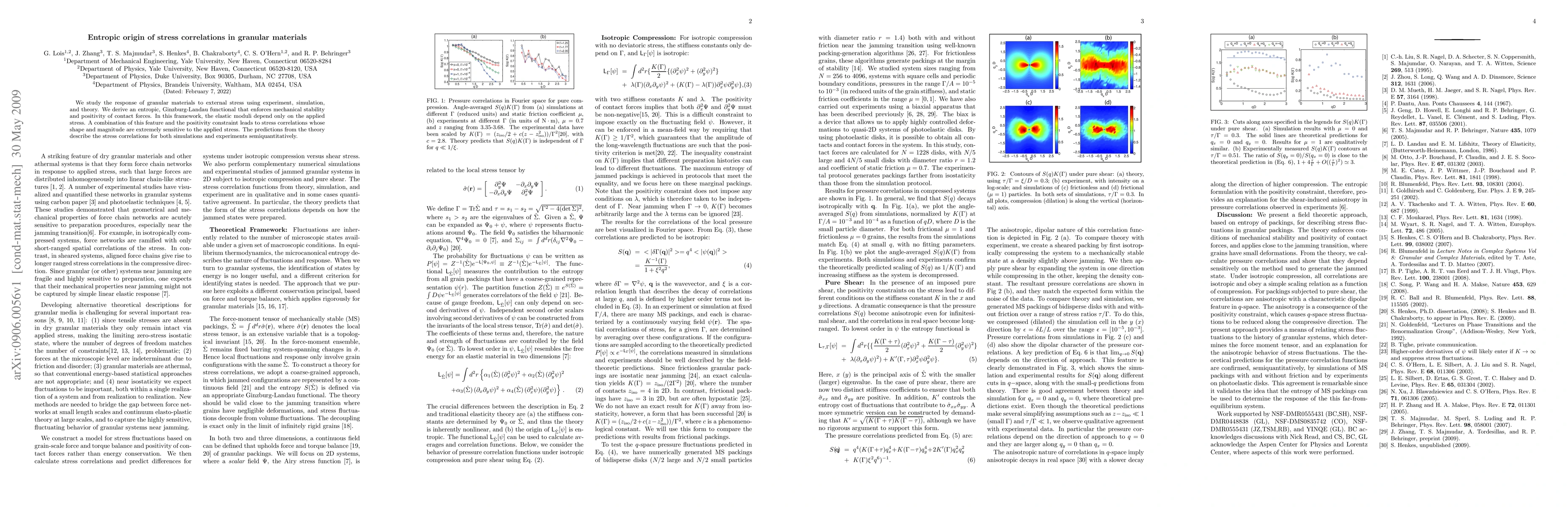 This paper develops an entropic, Ginzburg-Landau functional to model stress correlations in granular materials, showing that elastic moduli depend solely on applied stress, leading to stress correlations sensitive to stress levels, with theoretical predictions matching experimental and simulated data semiquantitatively.