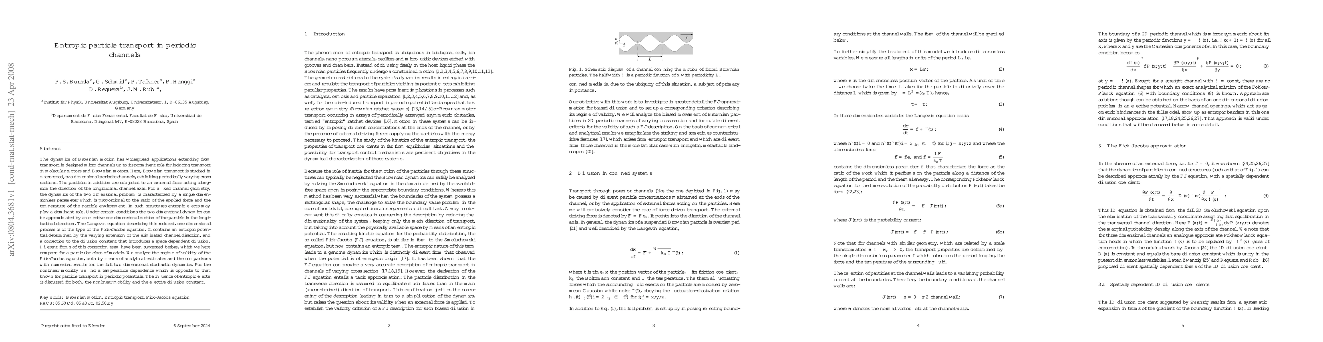 The dynamics of Brownian motion has widespread applications extending from transport in designed micro-channels up to its prominent role for inducing transport in molecular motors and Brownian motors. Here, Brownian transport is studied in micro-sized, two dimensional periodic channels, exhibiting periodically varying cross sections. The particles in addition are subjected to an external force acting alongside the direction of the longitudinal channel axis. For a fixed channel geometry, the dynamics of the two dimensional problem is characterized by a single dimensionless parameter which is proportional to the ratio of the applied force and the temperature of the particle environment. In such structures entropic effects may play a dominant role. Under certain conditions the two dimensional dynamics can be approximated by an effective one dimensional motion of the particle in the longitudinal direction. The Langevin equation describing this reduced, one dimensional process is of the type of the Fick-Jacobs equation. It contains an entropic potential determined by the varying extension of the eliminated channel direction, and a correction to the diffusion constant that introduces a space dependent diffusion. Different forms of this correction term have been suggested before, which we here compare for a particular class of models. We analyze the regime of validity of the Fick-Jacobs equation, both by means of analytical estimates and the comparisons with numerical results for the full two dimensional stochastic dynamics. For the nonlinear mobility we find a temperature dependence which is opposite to that known for particle transport in periodic potentials. The influence of entropic effects is discussed for both, the nonlinear mobility and the effective diffusion constant.