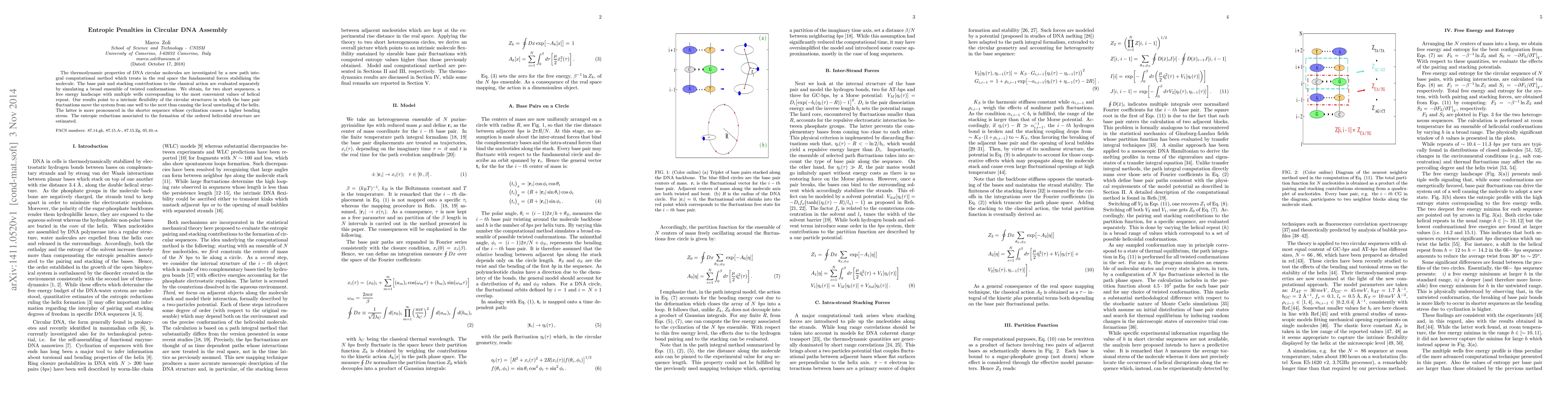 The thermodynamic properties of DNA circular molecules are investigated by a new path integral computational method which treats in the real space the fundamental forces stabilizing the molecule. The base pair and stacking contributions to the classical action are evaluated separately by simulating a broad ensemble of twisted conformations. We obtain, for two short sequences, a free energy landscape with multiple wells corresponding to the most convenient values of helical repeat. Our results point to a intrinsic flexibility of the circular structures in which the base pair fluctuations move the system from one well to the next thus causing the local unwinding of the helix. The latter is more pronounced in the shorter sequence whose cyclization causes a higher bending stress. The entropic reductions associated to the formation of the ordered helicoidal structure are estimated.