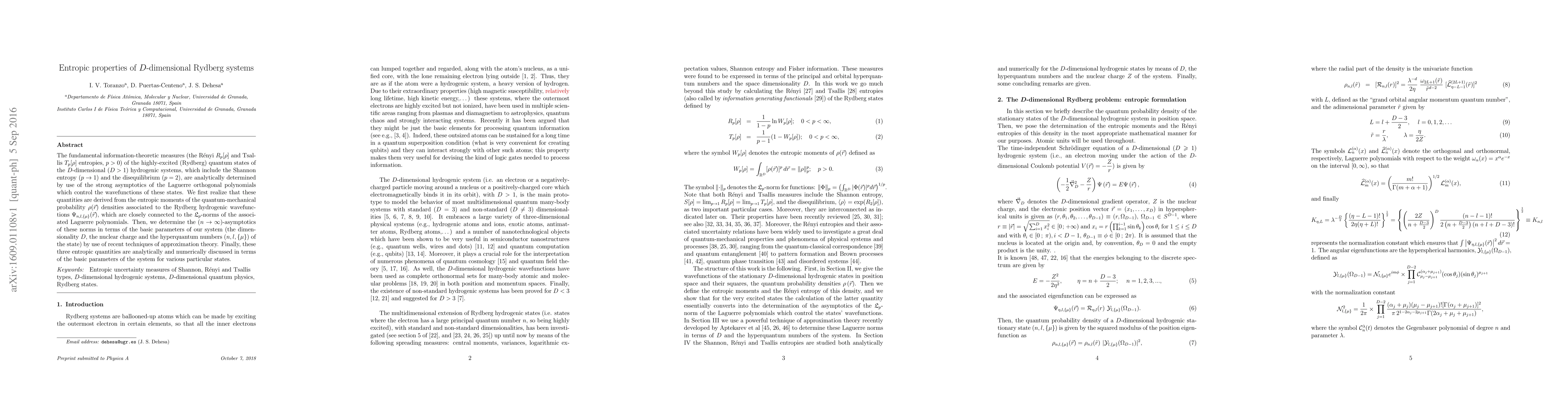 The fundamental information-theoretic measures (the R\'enyi $R_{p}[\rho]$ and Tsallis $T_{p}[\rho]$ entropies, $p>0$) of the highly-excited (Rydberg) quantum states of the $D$-dimensional ($D>1$) hydrogenic systems, which include the Shannon entropy ($p \to 1$) and the disequilibrium ($p = 2$), are analytically determined by use of the strong asymptotics of the Laguerre orthogonal polynomials which control the wavefunctions of these states. We first realize that these quantities are derived from the entropic moments of the quantum-mechanical probability $\rho(\vec{r})$ densities associated to the Rydberg hydrogenic wavefunctions $\Psi_{n,l,\{\mu\}}(\vec{r})$, which are closely connected to the $\mathfrak{L}_{p}$-norms of the associated Laguerre polynomials. Then, we determine the ($n\to\infty$)-asymptotics of these norms in terms of the basic parameters of our system (the dimensionality $D$, the nuclear charge and the hyperquantum numbers $(n,l,\{\mu\}$) of the state) by use of recent techniques of approximation theory. Finally, these three entropic quantities are analytically and numerically discussed in terms of the basic parameters of the system for various particular states.