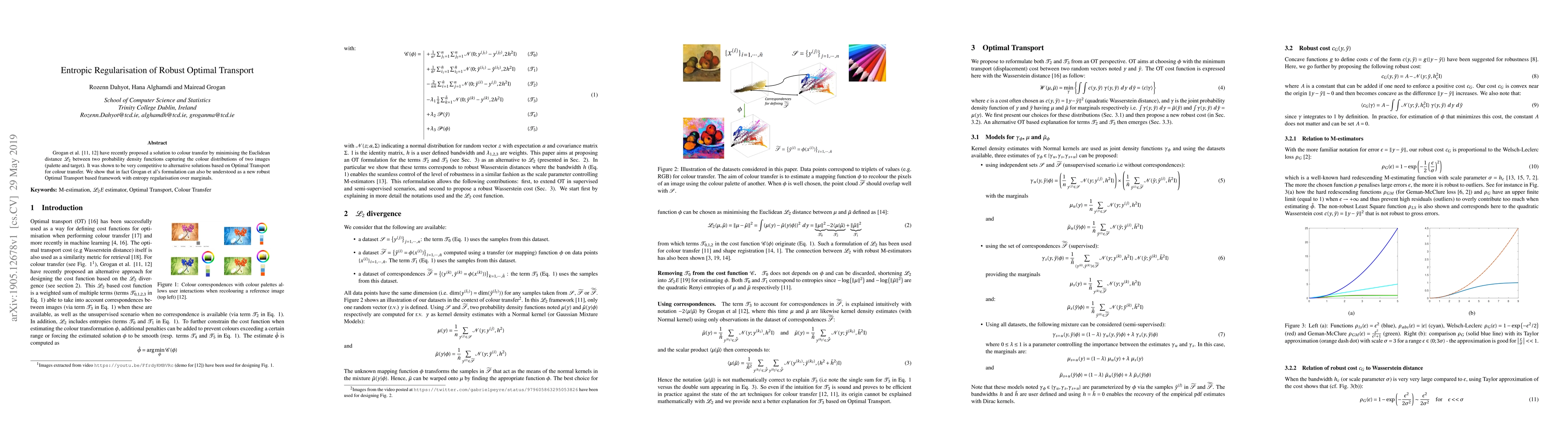 Summary: Grogan et al.'s method for colour transfer, based on minimising L2 distance between colour distributions, is reinterpreted as a robust Optimal Transport framework with entropy regularisation, offering competitive results to traditional Optimal Transport solutions.