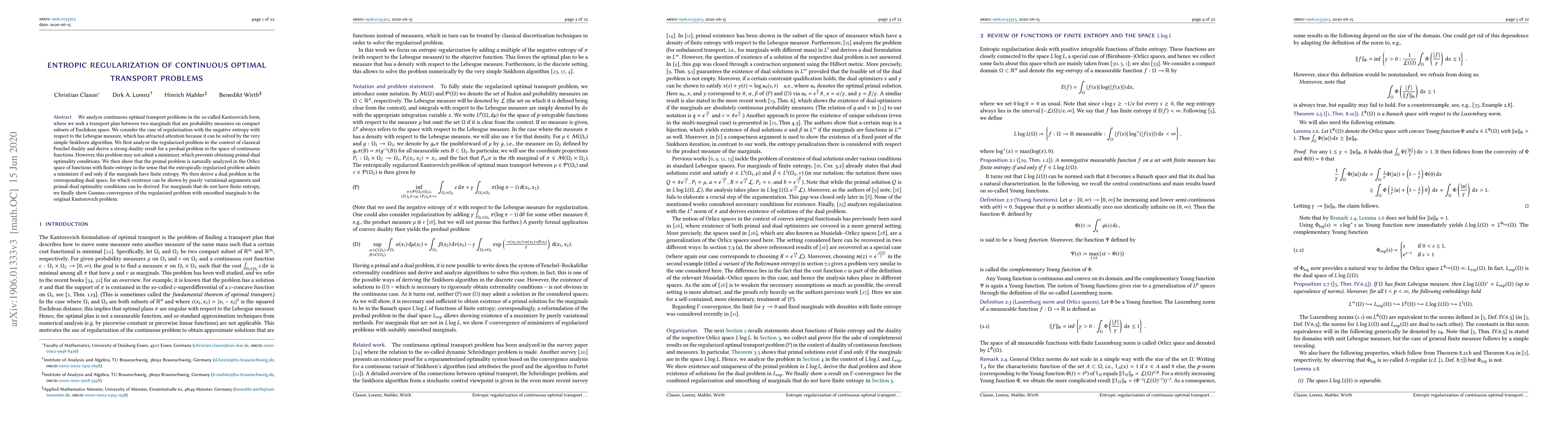 This paper explores the entropic regularization of continuous optimal transport problems, demonstrating that the regularized problem admits a minimizer if the marginals have finite entropy. It derives a dual problem and primal-dual optimality conditions, and shows Gamma-convergence for marginals with infinite entropy.