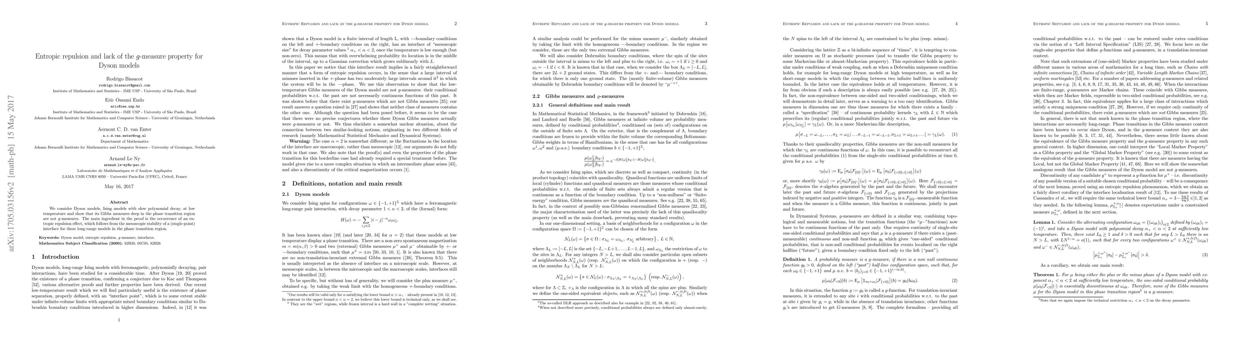 This paper demonstrates that Gibbs measures for Dyson models at low temperature lack the $g$-measure property due to an entropic repulsion effect, stemming from the mesoscopic stability of a single-point interface in the phase transition region.