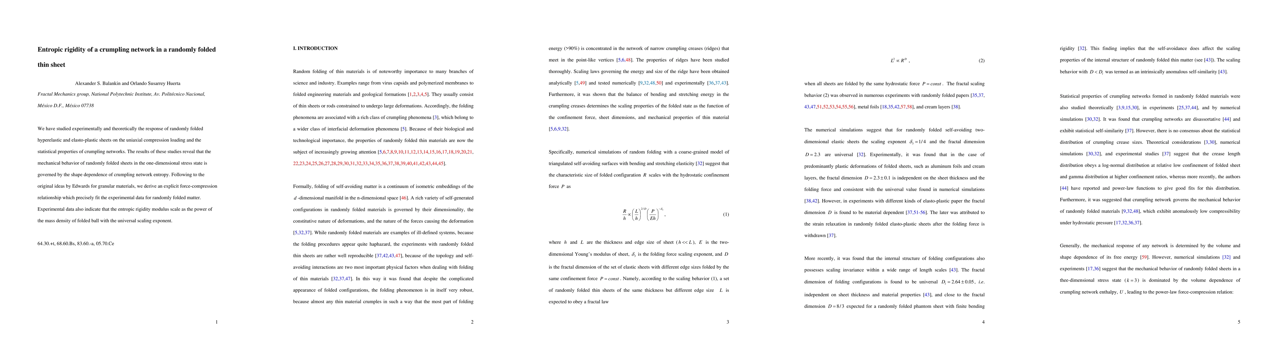 We have studied experimentally and theoretically the response of randomly folded hyperelastic and elastoplastic sheets on the uniaxial compression loading and the statistical properties of crumpling networks. The results of these studies reveal that the mechanical behavior of randomly folded sheets in the one-dimensional stress state is governed by the shape dependence of the crumpling network entropy. Following up on the original ideas by Edwards for granular materials, we derive an explicit force-compression relationship which precisely fits the experimental data for randomly folded matter. Experimental data also indicate that the entropic rigidity modulus scales as the power of the mass density of the folded ball with universal scaling exponent.