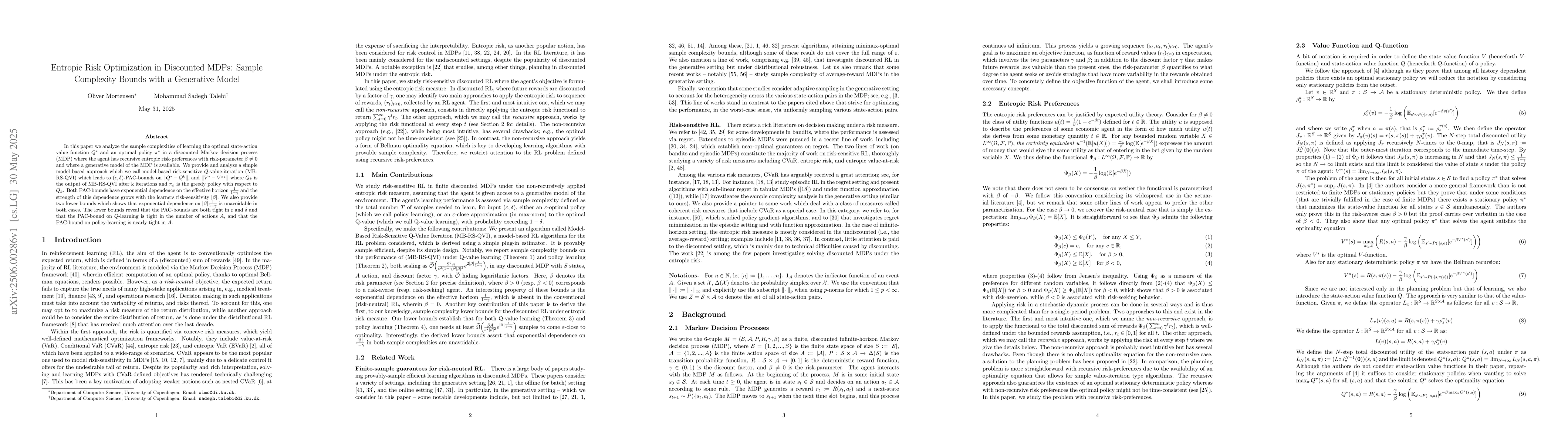 A research paper analyzes sample complexities of learning optimal state-action value functions and policies in discounted MDPs with recursive entropic risk preferences, providing bounds on the error of learning algorithms.