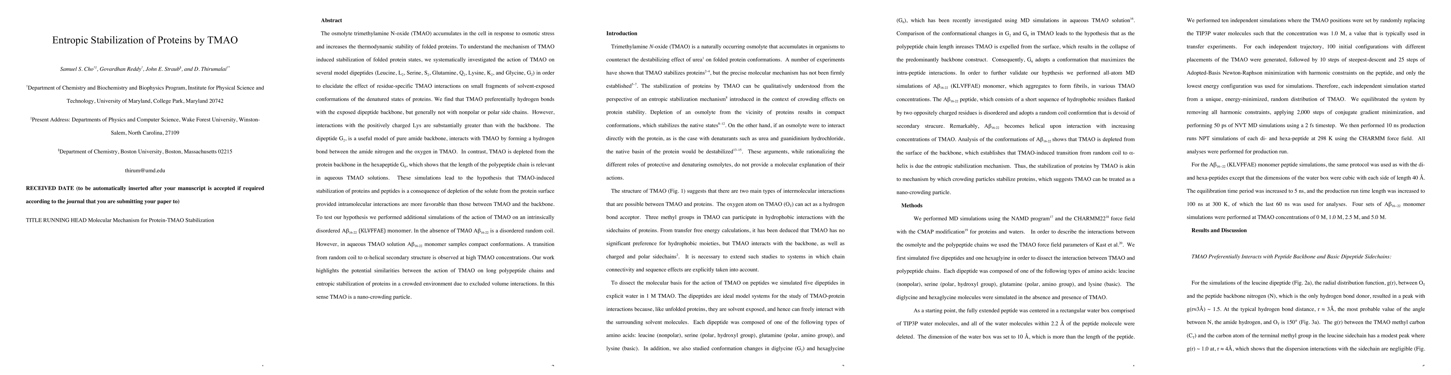 To understand the mechanism of trimethylamine N-oxide (TMAO) induced stabilization of folded protein states, we systematically investigated the action of TMAO on several model dipeptides (Leucine, L2, Serine, S2, Glutamine, Q2, Lysine, K2, and Glycine, G2) in order to elucidate the effect of residue-specific TMAO interactions on small fragments of solvent-exposed conformations of the denatured states of proteins. We find that TMAO preferentially hydrogen bonds with the exposed dipeptide backbone, but generally not with nonpolar or polar side chains. However, interactions with the positively charged Lys are substantially greater than with the backbone. The dipeptide G2, is a useful model of pure amide backbone, interacts with TMAO by forming a hydrogen bond between the amide nitrogen and the oxygen in TMAO. In contrast, TMAO is depleted from the protein backbone in the hexapeptide G6, which shows that the length of the polypeptide chain is relevant in aqueous TMAO solutions. These simulations lead to the hypothesis that TMAO-induced stabilization of proteins and peptides is a consequence of depletion of the solute from the protein surface provided intramolecular interactions are more favorable than those between TMAO and the backbone. To test our hypothesis we performed additional simulations of the action of TMAO on an intrinsically disordered A{\beta}16-22 (KLVFFAE) monomer. In the absence of TMAO A{\beta}16-22 is a disordered random coil. However, in aqueous TMAO solution A{\beta}16-22 monomer samples compact conformations. A transition from random coil to {\alpha}-helical secondary structure is observed at high TMAO concentrations. Our work highlights the potential similarities between the action of TMAO on long polypeptide chains and entropic stabilization of proteins in a crowded environment due to excluded volume interactions. In this sense TMAO is a nano-crowding particle.