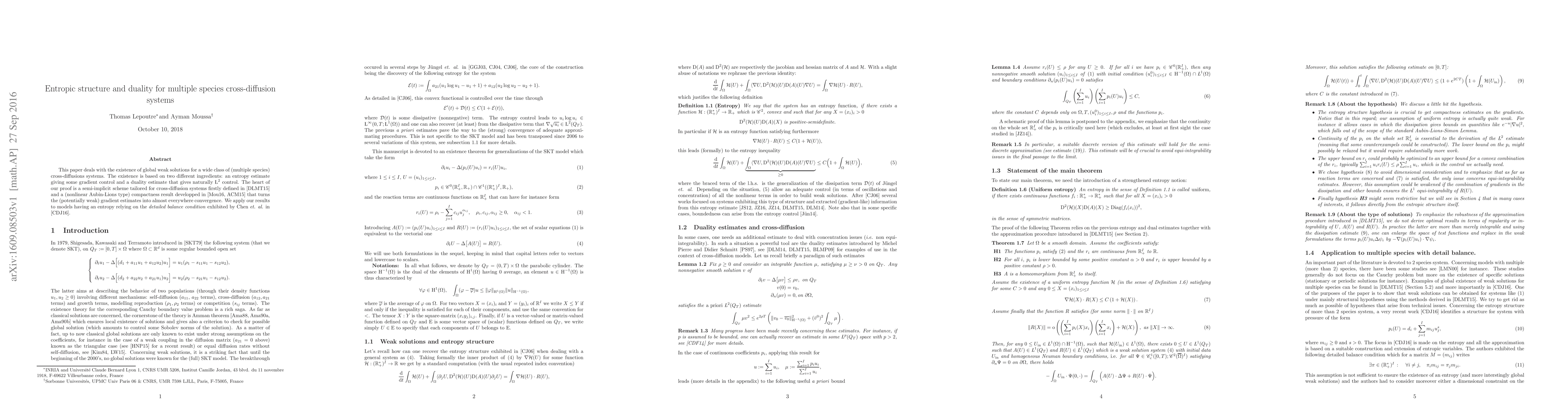 This paper establishes global weak solutions for multiple species cross-diffusion systems using entropy and duality estimates, leveraging a semi-implicit scheme. The results are applied to models adhering to the detailed balance condition.