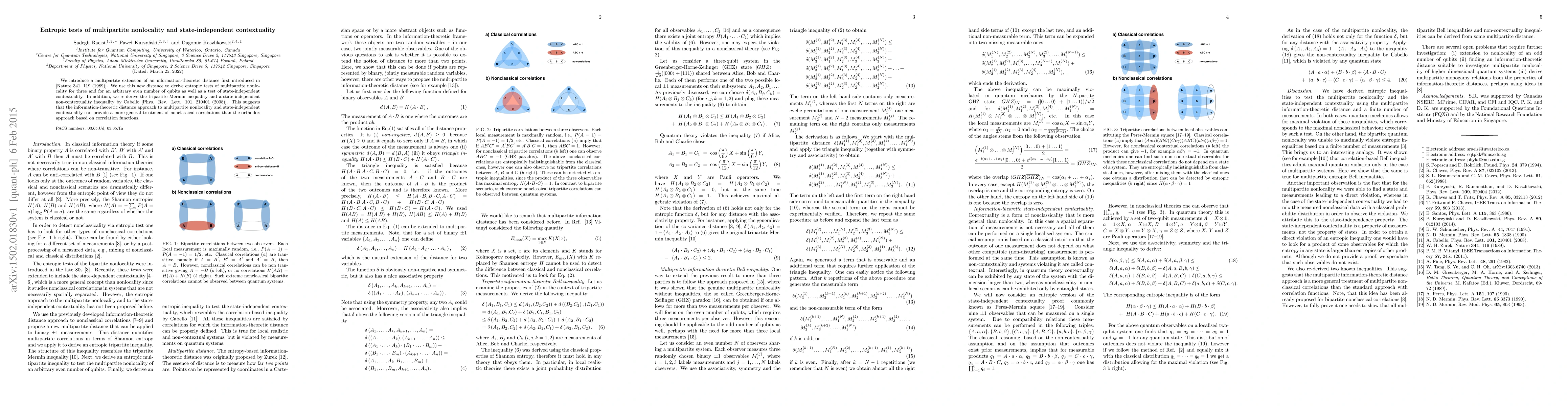 This paper develops a multipartite extension of an information-theoretic distance to create entropic tests for multipartite nonlocality and state-independent contextuality, extending beyond bipartite scenarios. It derives tests for both three and even numbers of qubits, and revisits the Mermin inequality and a state-independent contextuality inequality, suggesting a broader applicability of the distance-based approach compared to traditional correlation-function methods.