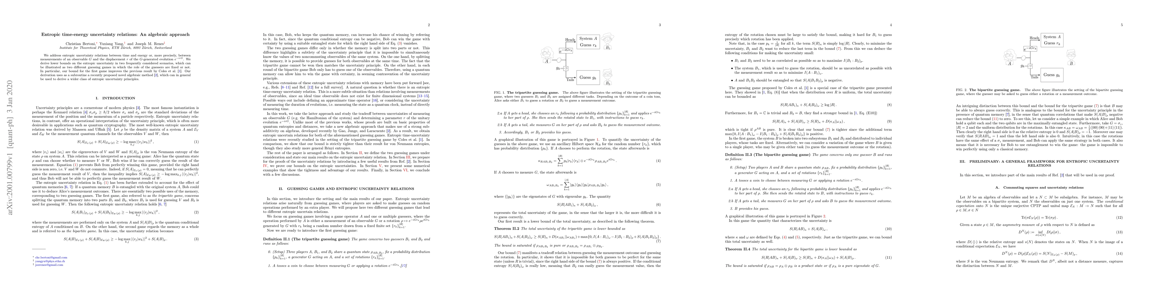 The research employs an algebraic approach using a novel method to derive entropic uncertainty principles, specifically focusing on time-energy uncertainty relations through two guessing games with fixed and variable guessers.