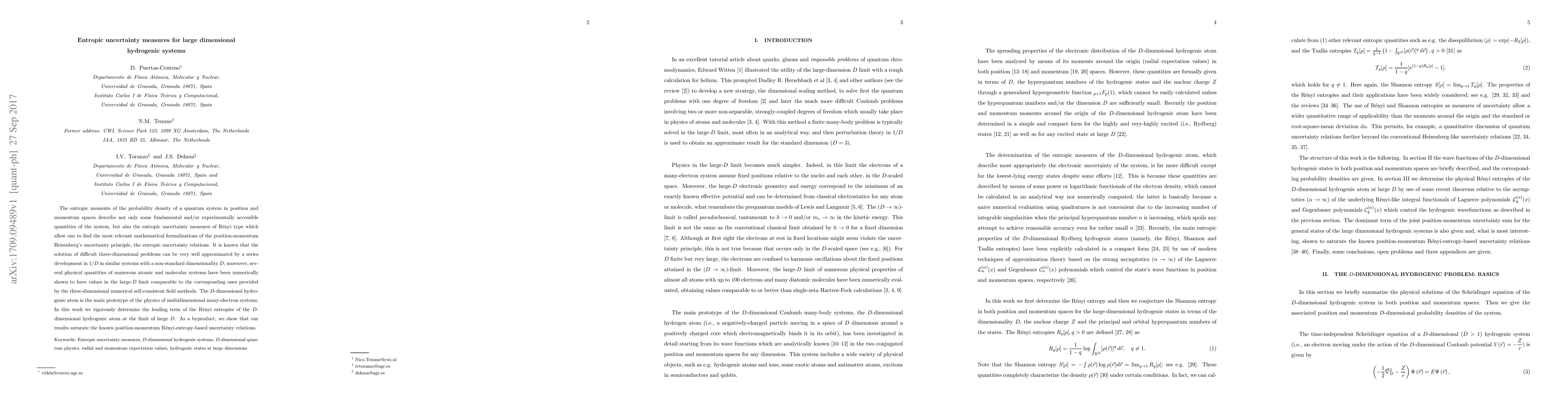 This paper rigorously determines the leading term of the Rényi entropies for large dimensional hydrogenic systems, demonstrating their relevance to the entropic uncertainty relations and showing that these results match known uncertainty bounds. The study also highlights the applicability of large $D$ approximations for complex three-dimensional quantum systems.