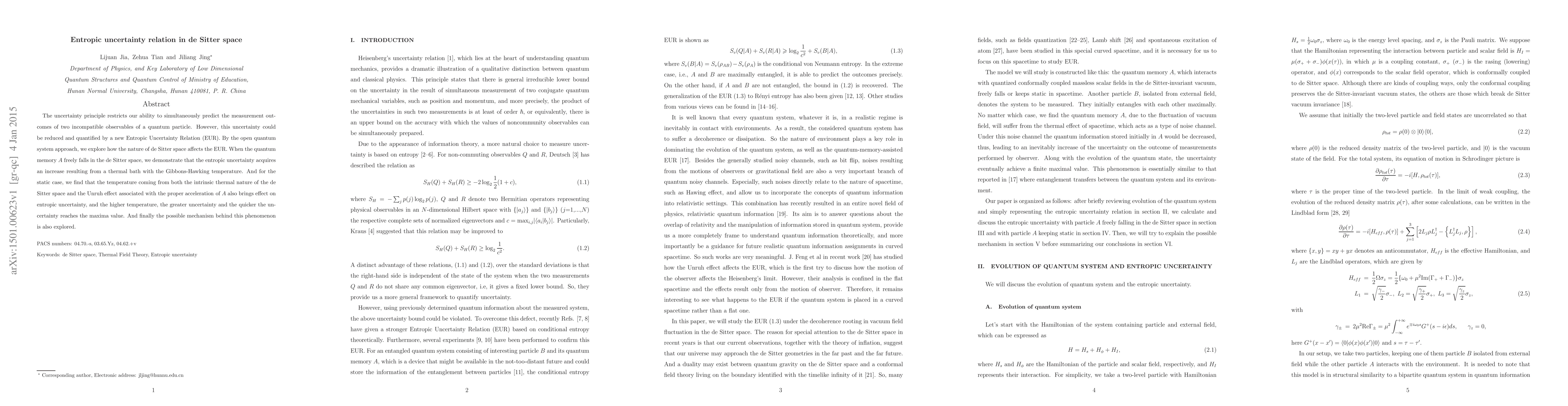 This paper investigates how the nature of de Sitter space influences the Entropic Uncertainty Relation (EUR) for a quantum particle. It finds that the EUR increases due to the Gibbons-Hawking temperature in freely falling scenarios, while static conditions involving both the intrinsic thermal nature of de Sitter space and the Unruh effect further enhance the uncertainty, with higher temperatures leading to greater uncertainty and quicker attainment of maximum values.