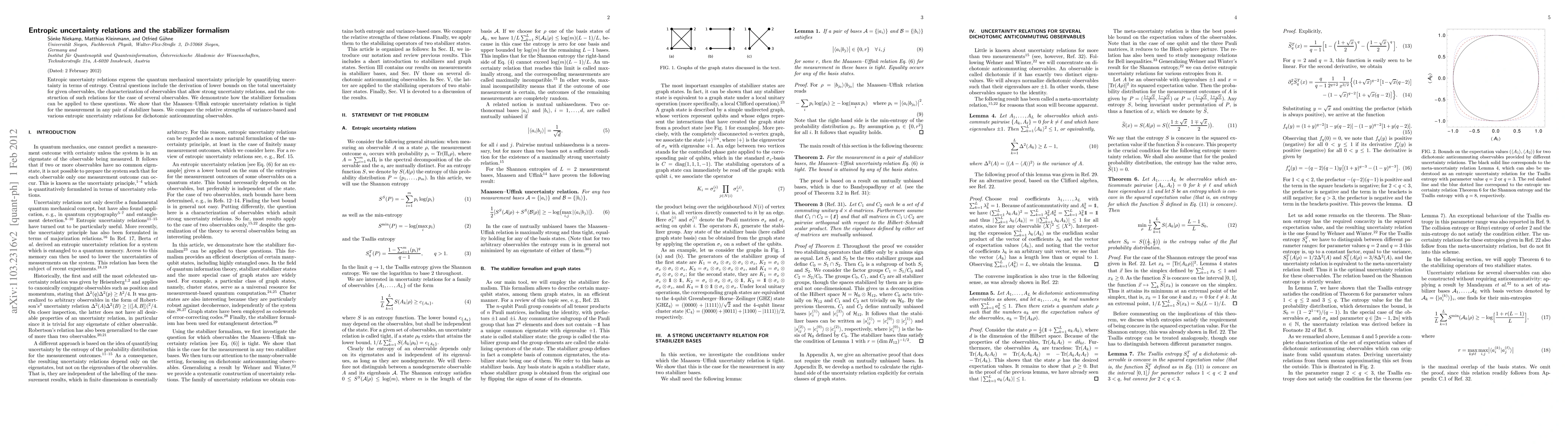 This paper explores entropic uncertainty relations using the stabilizer formalism, demonstrating that the Maassen-Uffink relation is tight for stabilizer bases. It also compares variance-based and entropic uncertainty relations for dichotomic anticommuting observables.