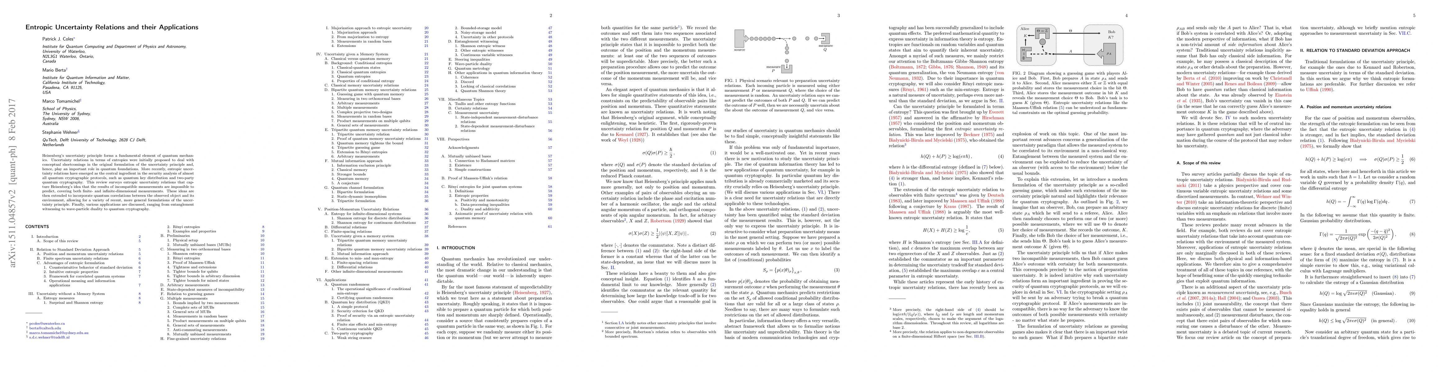 This paper reviews entropic uncertainty relations, which address conceptual limitations in Heisenberg's uncertainty principle, and explores their applications in quantum cryptography, entanglement witnessing, and wave-particle duality. It covers both finite- and infinite-dimensional measurements and extends the principle to include quantum correlations.