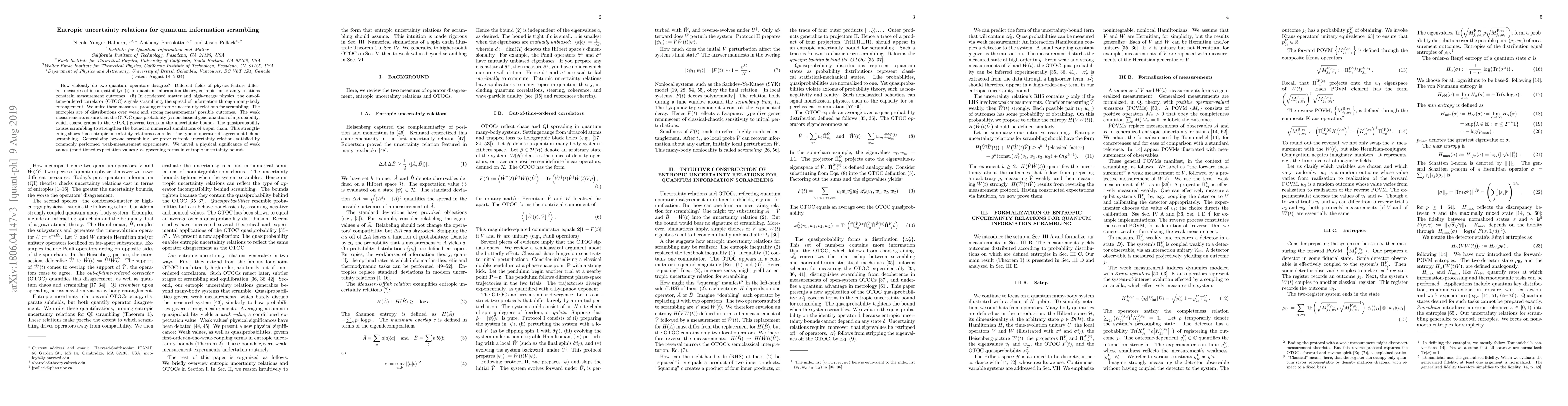 How violently do two quantum operators disagree? Different fields of physics feature different measures of incompatibility: (i) In quantum information theory, entropic uncertainty relations constrain measurement outcomes. (ii) In condensed matter and high-energy physics, the out-of-time-ordered correlator (OTOC) signals scrambling, the spread of information through many-body entanglement. We unite these measures, proving entropic uncertainty relations for scrambling. The entropies are of distributions over weak and strong measurements' possible outcomes. The weak measurements ensure that the OTOC quasiprobability (a nonclassical generalization of a probability, which coarse-grains to the OTOC) governs terms in the uncertainty bound. The quasiprobability causes scrambling to strengthen the bound in numerical simulations of a spin chain. This strengthening shows that entropic uncertainty relations can reflect the type of operator disagreement behind scrambling. Generalizing beyond scrambling, we prove entropic uncertainty relations satisfied by commonly performed weak-measurement experiments. We unveil a physical significance of weak values (conditioned expectation values): as governing terms in entropic uncertainty bounds.