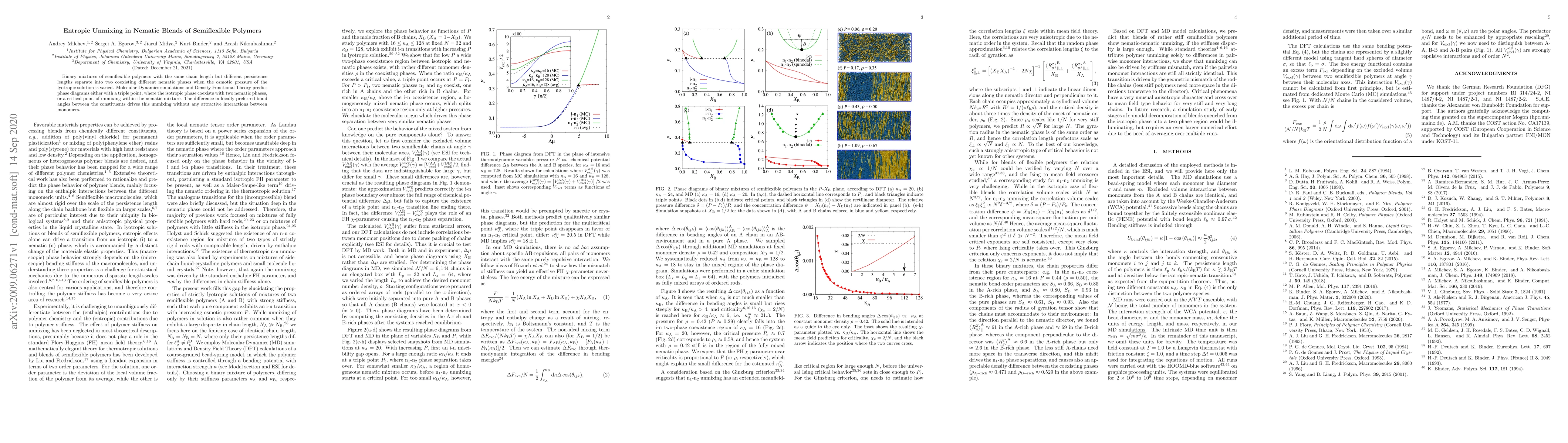 This paper investigates the entropic unmixing of semiflexible polymers in nematic blends, revealing that differences in persistence lengths lead to phase separation into two nematic phases without monomer attraction, predicted by simulations and theory. The unmixing is driven by variations in locally preferred bond angles.