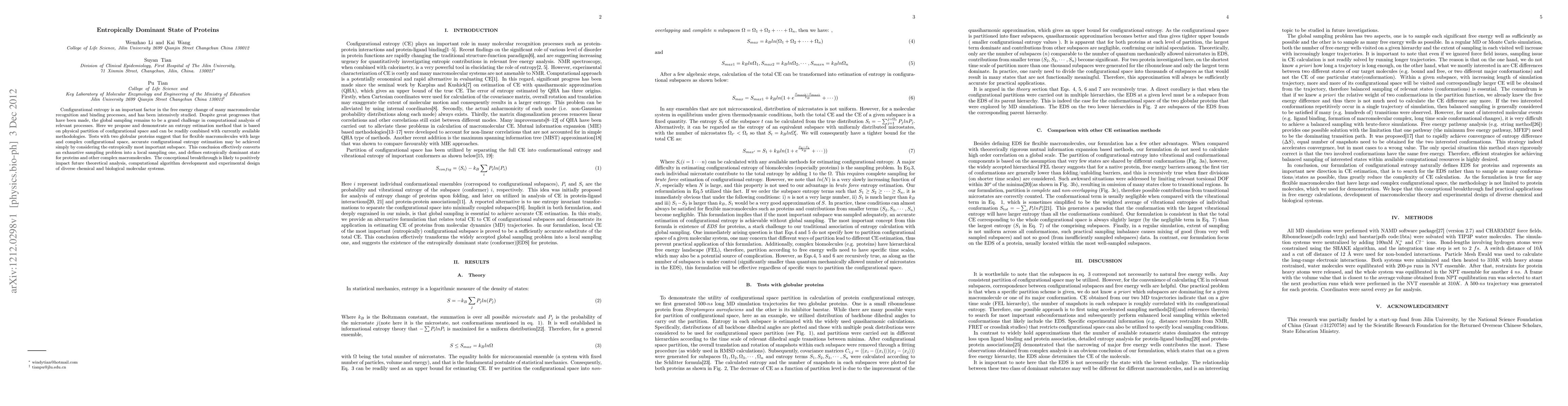Configurational entropy is an important factor in the free energy change of many macromolecular recognition and binding processes, and has been intensively studied. Despite great progresses that have been made, the global sampling remains to be a grand challenge in computational analysis of relevant processes. Here we propose and demonstrate an entropy estimation method that is based on physical partition of configurational space and can be readily combined with currently available methodologies. Tests with two globular proteins suggest that for flexible macromolecules with large and complex configurational space, accurate configurational entropy estimation may be achieved simply by considering the entropically most important subspace. This conclusion effectively converts an exhaustive sampling problem into a local sampling one, and defines entropically dominant state for proteins and other complex macromolecules. The conceptional breakthrough is likely to positively impact future theoretical analysis, computational algorithm development and experimental design of diverse chemical and biological molecular systems.