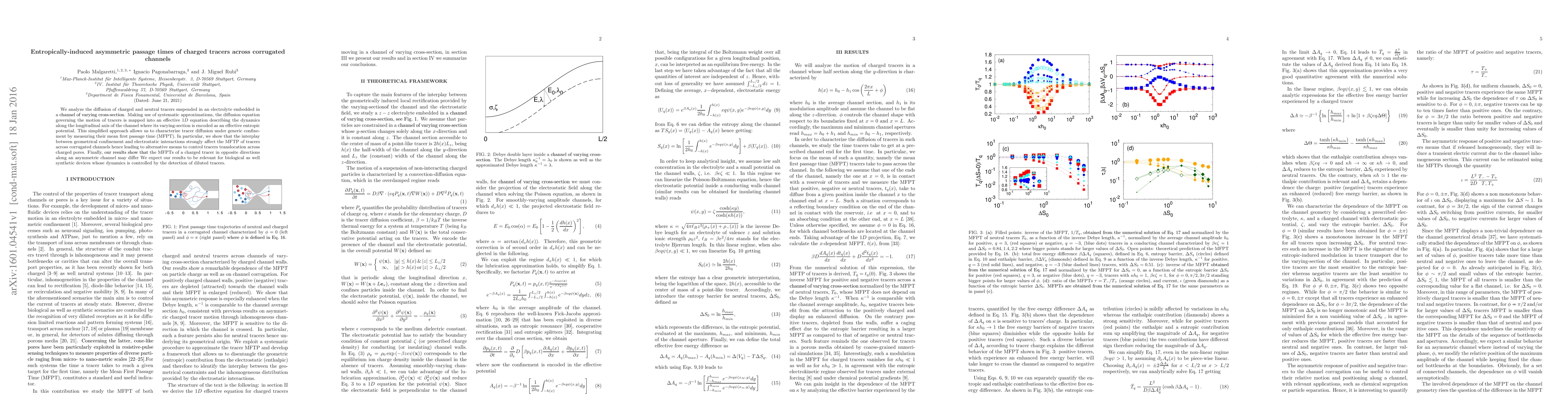 We analyze the diffusion of charged and neutral tracers suspended in an electrolyte embedded in a channel of varying cross-section. Making use of systematic approximations, the diffusion equation governing the motion of tracers is mapped into an effective $1D$ equation describing the dynamics along the longitudinal axis of the channel where its varying-section is encoded as an effective entropic potential. This simplified approach allows us to characterize tracer diffusion under generic confinement by measuring their mean first passage time (MFPT). In particular, we show that the interplay between geometrical confinement and electrostatic interactions strongly affect the MFTP of tracers across corrugated channels hence leading to alternative means to control tracers translocation across charged pores. Finally, our results show that the MFPTs of a charged tracer in opposite directions along an asymmetric channel may differ. We expect our results to be relevant for biological as well synthetic devices whose dynamics is controlled by the detection of diluted tracers.
