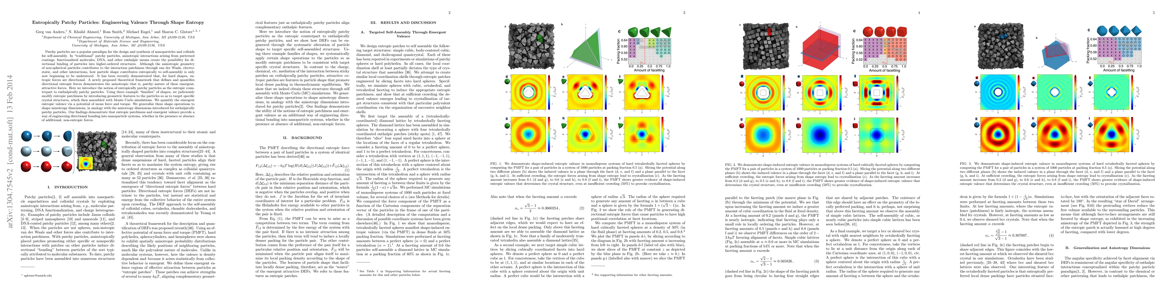 This paper introduces entropically patchy particles, which leverage shape entropy to engineer directional bonding in nanoparticle systems. The study proposes a theoretical framework to quantify these entropic forces and demonstrates how geometric modifications can target specific crystal structures through Monte Carlo simulations.