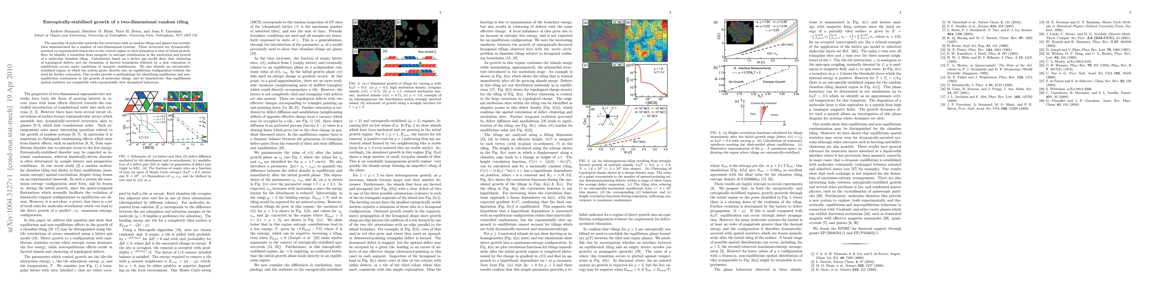 The assembly of molecular networks into structures such as random tilings and glasses has recently been demonstrated for a number of two-dimensional systems. These structures are dynamically-arrested on experimental timescales so the critical regime in their formation is that of initial growth. Here we identify a transition from energetic to entropic stabilisation in the nucleation and growth of a molecular rhombus tiling. Calculations based on a lattice gas model show that clustering of topological defects and the formation of faceted boundaries followed by a slow relaxation to equilibrium occurs under conditions of energetic stabilisation. We also identify an entropically-stabilised regime in which the system grows directly into an equilibrium configuration without the need for further relaxation. Our results provide a methodology for identifying equilibrium and non-equilibrium randomness in the growth of molecular tilings, and we demonstrate that equilibrium spatial statistics are compatible with exponentially slow dynamical behaviour.